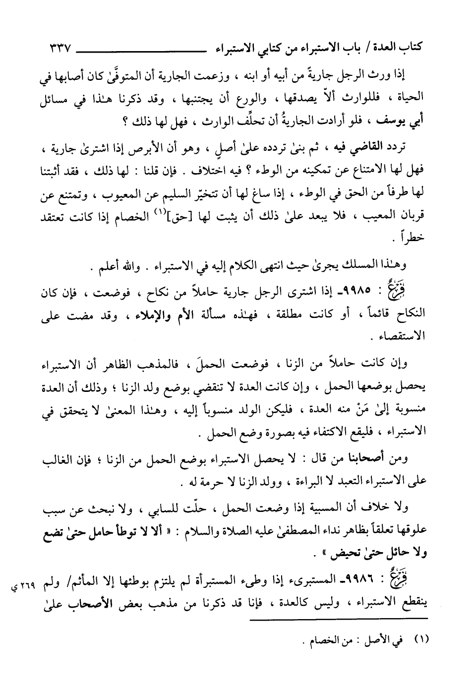 9985 - إذا اشترى الرجل جارية حاملاً من نكاح، فوضعت، فإن كان النكاح قائماً، أو كانت مطلقة، فهذه مسألة الأم والإملاء، وقد مضت على الاستقصاء.