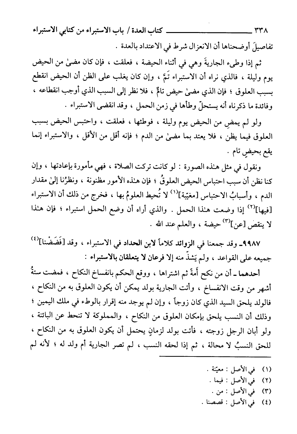 9987 - وقد جمعنا في الزوائد كلاماً لابن الحداد في الاستبراء، وقد [فَضَضْنا] (4) جميعه على القواعد، ولم يَشذّ منه إلا فرعان لا يتعلقان بالاستبراء: