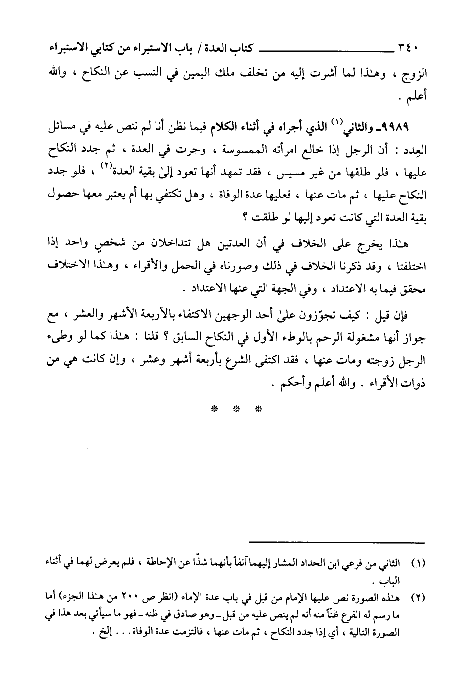 (2) هذه الصورة نص عليها الإمام من قبل في باب عدة الإماء (انظر ص200 من هذا الجزء) أما ما رسم له الفرع ظنّاً منه أنه لم ينص عليه من قبل -وهو صادق في ظنه- فهو ما سيأتي بعد هذا في الصورة التالية، أي إذا جدد النكاح، ثم مات عنها، فالتزمت عدة الوفاة ... إلخ.