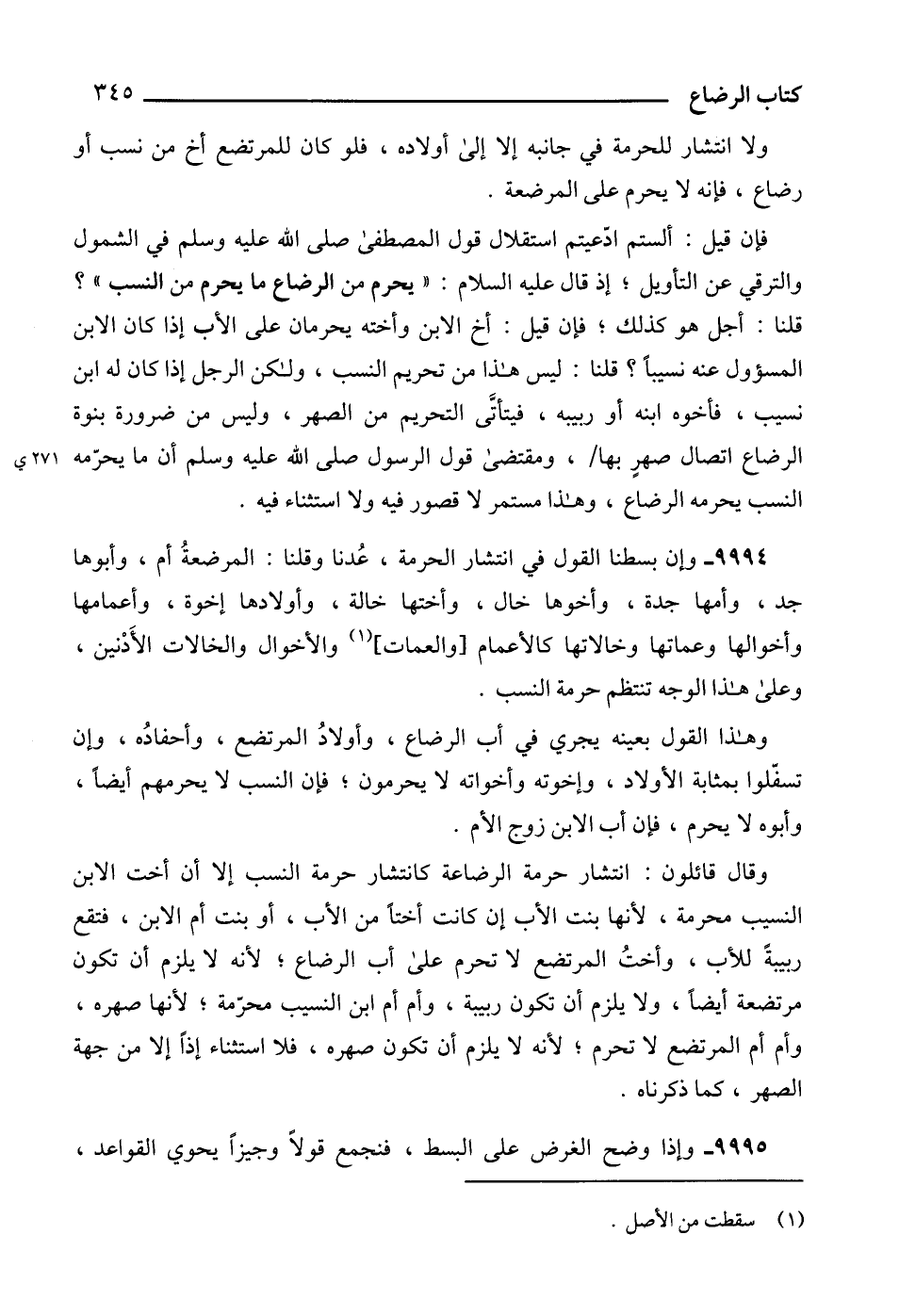 9994 - وإن بسطنا القول في انتشار الحرمة، عُدنا وقلنا: المرضعةُ أم، وأبوها جد، وأمها جدة، وأخوها خال، وأختها خالة، وأولادها إخوة، وأعمامها وأخوالها وعماتها وخالاتها كالأعمام [والعمات] (1) والأخوال والخالات الأَدْنين، وعلى هذا الوجه تنتظم حرمة النسب.