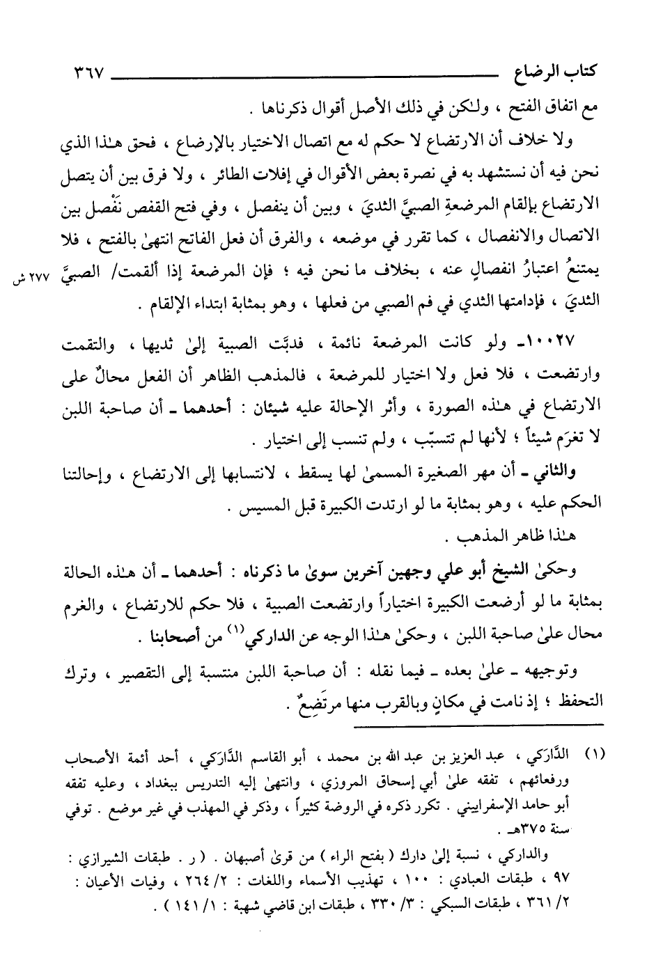 (1) الدَّارَكي، عبد العزيز بن عبد الله بن محمد، أبو القاسم الدَّارَكي، أحد أئمة الأصحاب ورفعائهم، تفقه على أبي إسحاق المروزي، وانتهى إليه التدريس ببغداد، وعليه تفقه أبو حامد الإسفراييني. تكرر ذكره في الروضة كثيراً، وذكر في المهذب في غير موضع. توفي سنة 375 هـ.