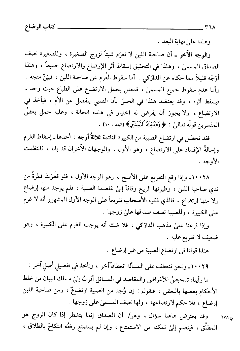 10029 - ونحن ننعطف على المسألة انعطافاً آخر، ونأخذ في تفصيلِ أصلٍ آخر: ما رأيناه تمحيصٌ للأغراض والمقاصد في المسائل أقربُ إلى مسلك البيان من خلط الأحكام بعضها بالبعض، فنقول: إن وُجد من الصبية ارتضاعٌ، ومن صاحبة اللبن إرضاع، فلا حكم لارتضاعها، ولها نصف المسمى على زوجها.