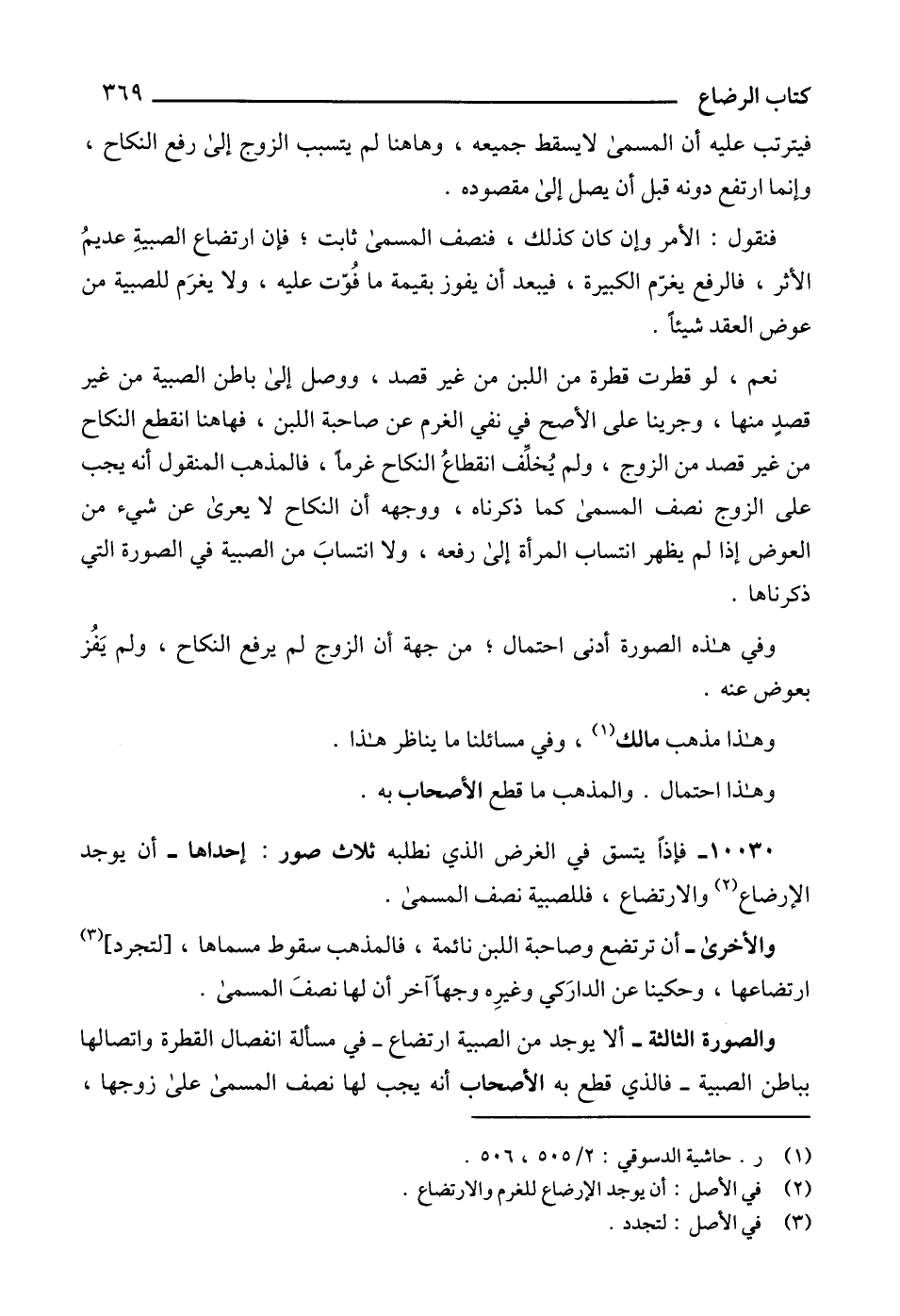 10030 - فإذاً يتسق في الغرض الذي نطلبه ثلاث صور: إحداها - أن يوجد الإرضاع (2) والارتضاع، فللصبية نصف المسمى.