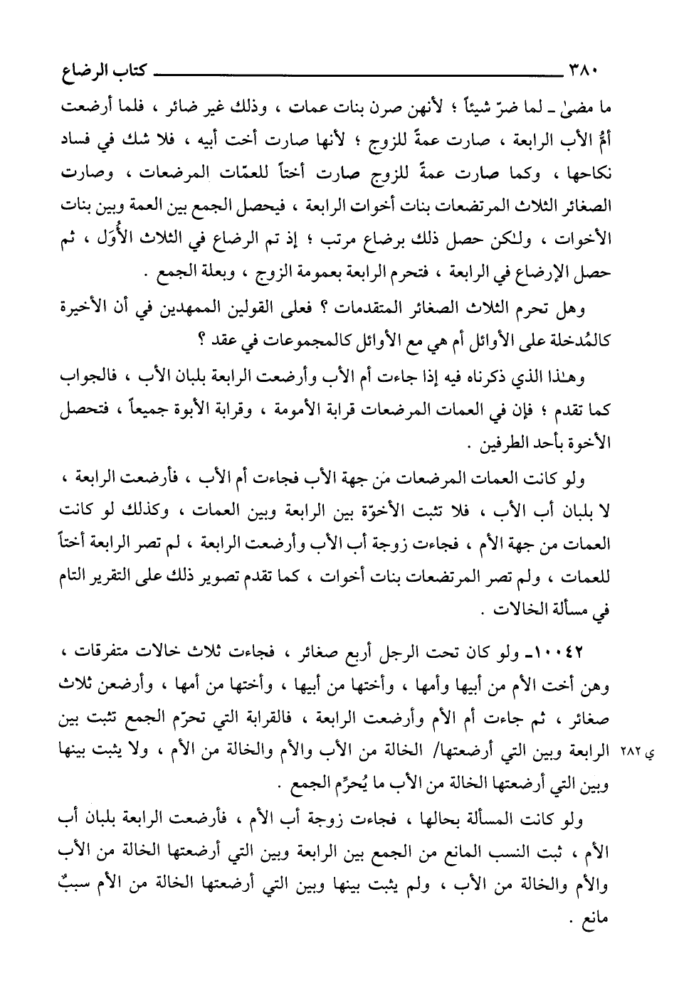 10042 - ولو كان تحت الرجل أربع صغائر، فجاءت ثلاث خالات متفرقات، وهن أخت الأم من أبيها وأمها، وأختها من أبيها، وأختها من أمها، وأرضعن ثلاث صغائر، ثم جاءت أم الأم وأرضعت الرابعة، فالقرابة التي تحرّم الجمع تثبت بين الرابعة وبين التي أرضعتها الخالة من الأب والأم والخالة من الأم، ولا يثبت بينها وبين التي أرضعتها الخالة من الأب ما يُحرِّم الجمع.