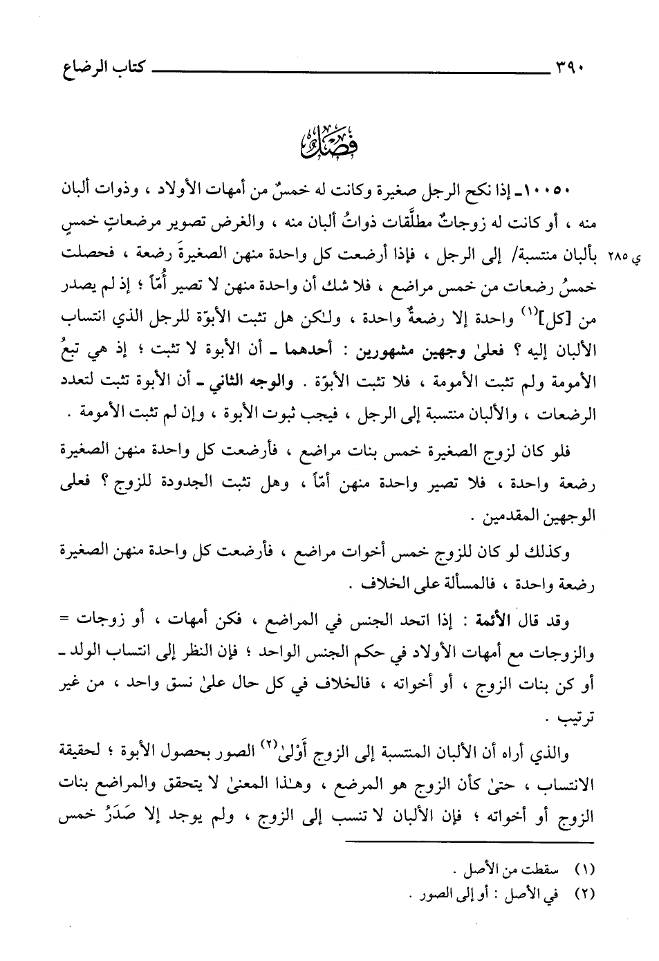 10050 - إذا نكح الرجل صغيرة وكانت له خمسٌ من أمهات الأولاد، وذوات ألبان منه، أو كانت له زوجاتٌ مطلَّقات ذواتُ ألبان منه، والغرض تصوير مرضعاتٍ خمسٍ بألبان منتسبة إلى الرجل، فإذا أرضعت كل واحدة منهن الصغيرةَ رضعة، فحصلت خمسُ رضعات من خمس مراضع، فلا شك أن واحدة منهن لا تصير أُمّاً؛ إذ لم يصدر من [كل] (1) واحدة إلا رضعةٌُ واحدة، ولكن هل تثبت الأبوّة للرجل الدي انتساب الألبان إليه؟ فعلى وجهين مشهورين: أحدهما - أن الأبوة لا تثبت؛ إذ هي تبعُ الأمومة ولم تثبت الأمومة، فلا تثبت الأبوّة. والوجه الثاني - أن الأبوة تثبت لتعدد الرضعات، والألبان منتسبة إلى الرجل، فيجب ثبوت الأبوة، وإن لم تثبت الأمومة.