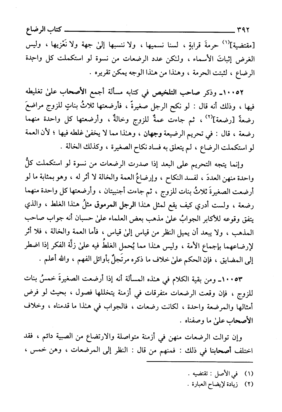 10052 - وذكر صاحب التلخيص في كتابه مسألة أجمع الأحاب على تغليطه فيها، وذلك أنه قال: لو نكح الرجل صغيرةً، فأرضعتها ثلاثُ بناتٍ للزوج مراضعَ رضعةً [رضعة] (2)، ثم جاءت عمةٌ للزوج وخالةٌ، وأرضعتها كل واحدة منهما رضعة، قال: في تحريم الرضيعة وجهان، وهذا مما لا يخفى غلطه فيها؛ لأن العمة لو استكملت الرضاع، لم يتعلق به فساد نكاح الصغيرة، وكذلك الخالة.