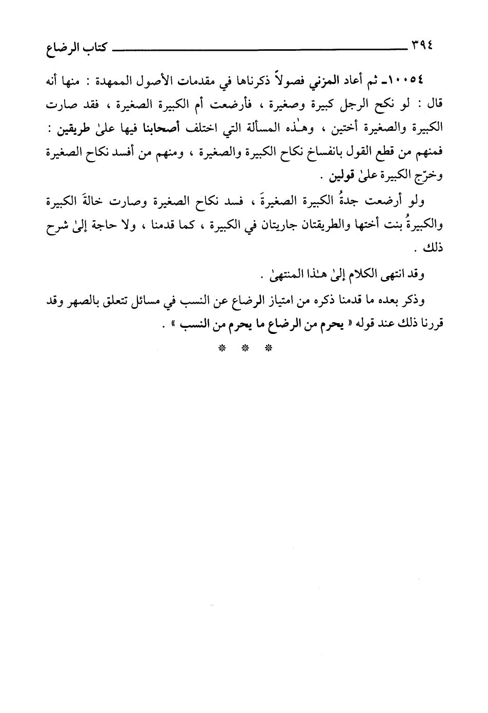 10054 - ثم أعاد المزني فصولاً ذكرناها في مقدمات الأصول الممهدة: منها أنه قال: لو نكح الرجل كبيرة وصغيرة، فأرضعت أم الكبيرة الصغيرة، فقد صارت الكبيرة والصغيرة أختين، وهذه المسألة التي اختلف أصحابنا فيها على طريقين: فمنهم من قطع القول بانفساخ نكاح الكبيرة والصغيرة، ومنهم من أفسد نكاح الصغيرة وخرّج الكبيرة على قولين.