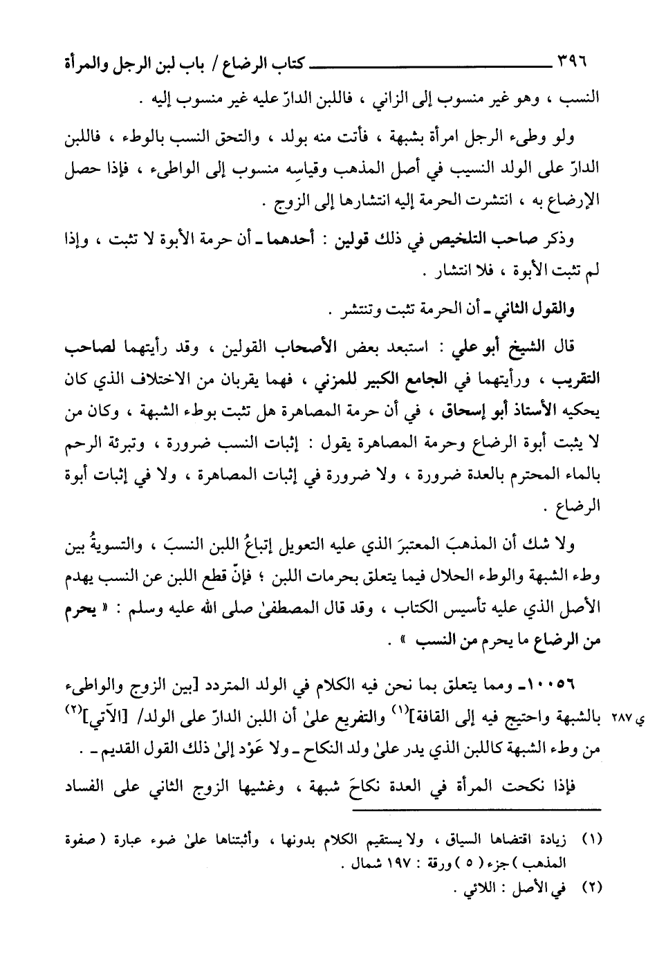 ولا شك أن المذهبَ المعتبرَ الذي عليه التعويل إتباعُ اللبن النسبَ، والتسويةُ بين وطء الشبهة والوطء الحلال فيما يتعلق بحرمات اللبن؛ فإنّ قطع اللبن عن النسب يهدم الأصل الذي عليه تأسيس الكتاب، وقد قال المصطفى صلى الله عليه وسلم: " يحرم من الرضاع ما يحرم من النسب ".