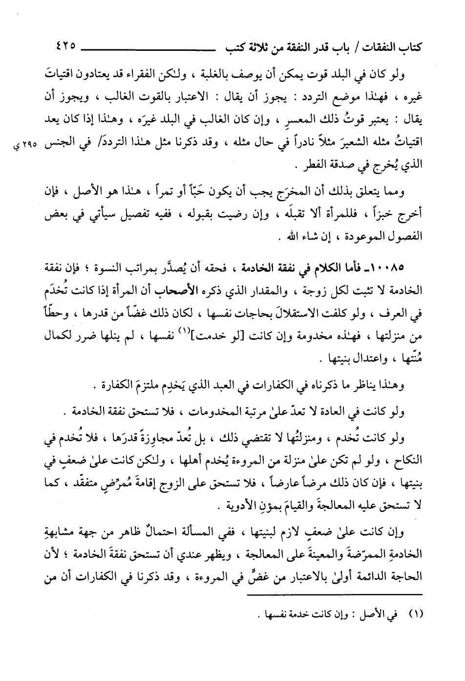10085 - فأما الكلام في نفقة الخادمة، فحقه أن يُصدَّر بمراتب النسوة؛ فإن نفقة الخادمة لا تثبت لكل زوجة، والمقدار الذي ذكره الأصحاب أن المرأة إذا كانت تُخدَم في العرف، ولو كلفت الاستقلالَ بحاجات نفسها، لكان ذلك غضّاً من قدرها، وحطّاً من منزلتها، فهذه مخدومة وإن كانت [لو خدمت] (1) نفسها، لم ينلها ضرر لكمال مُنّتها، واعتدال بنيتها.