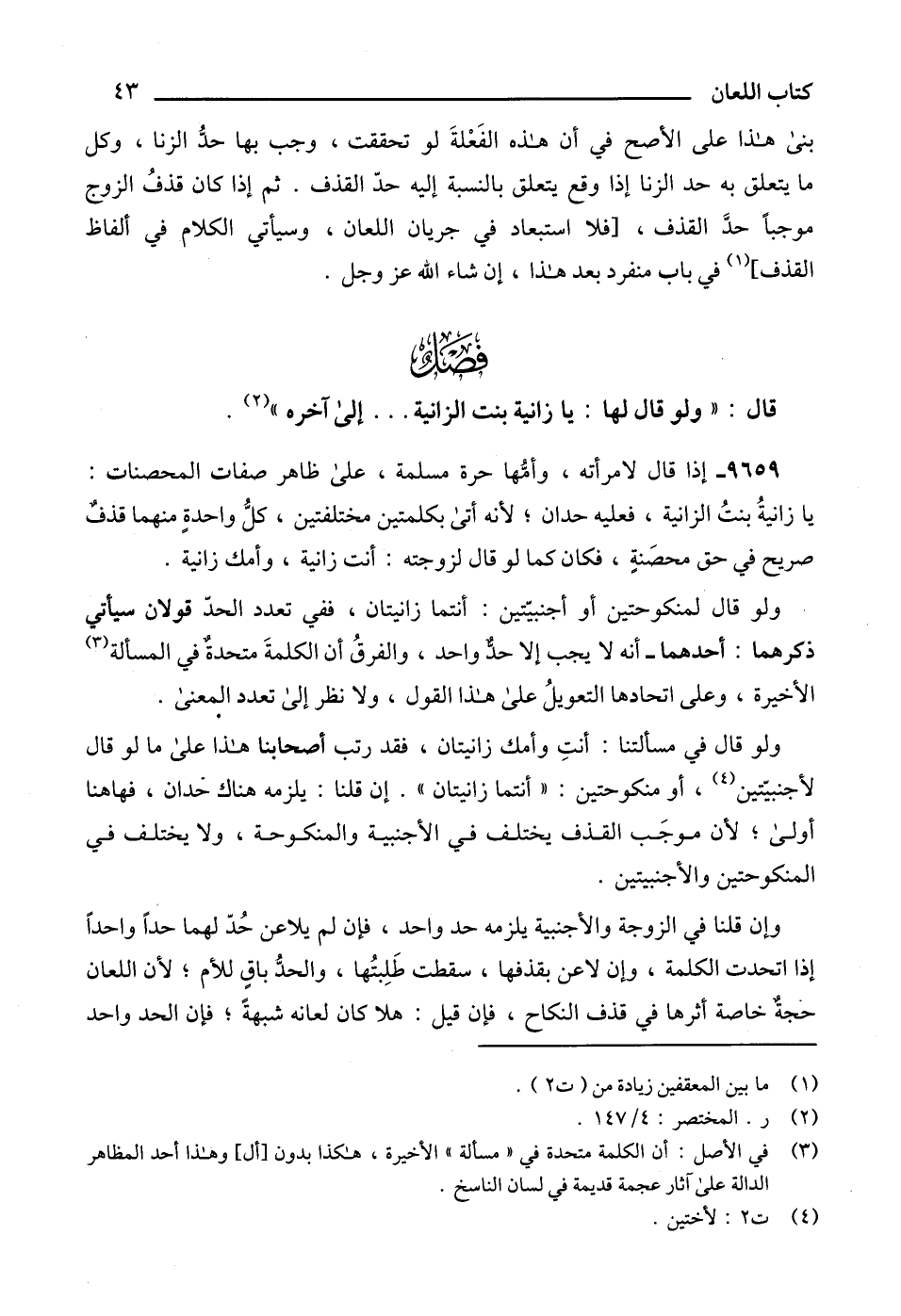9659 - إذا قال لامرأته، وأمُّها حرة مسلمة، على ظاهر صفات المحصنات: يا زانيةُ بنتُ الزانية، فعليه حدان؛ لأنه أتى بكلمتين مختلفتين، كلُّ واحدةٍ منهما قذفٌ صريح في حق محصَنةٍ، فكان كما لو قال لزوجته: أنت زانية، وأمك زانية.