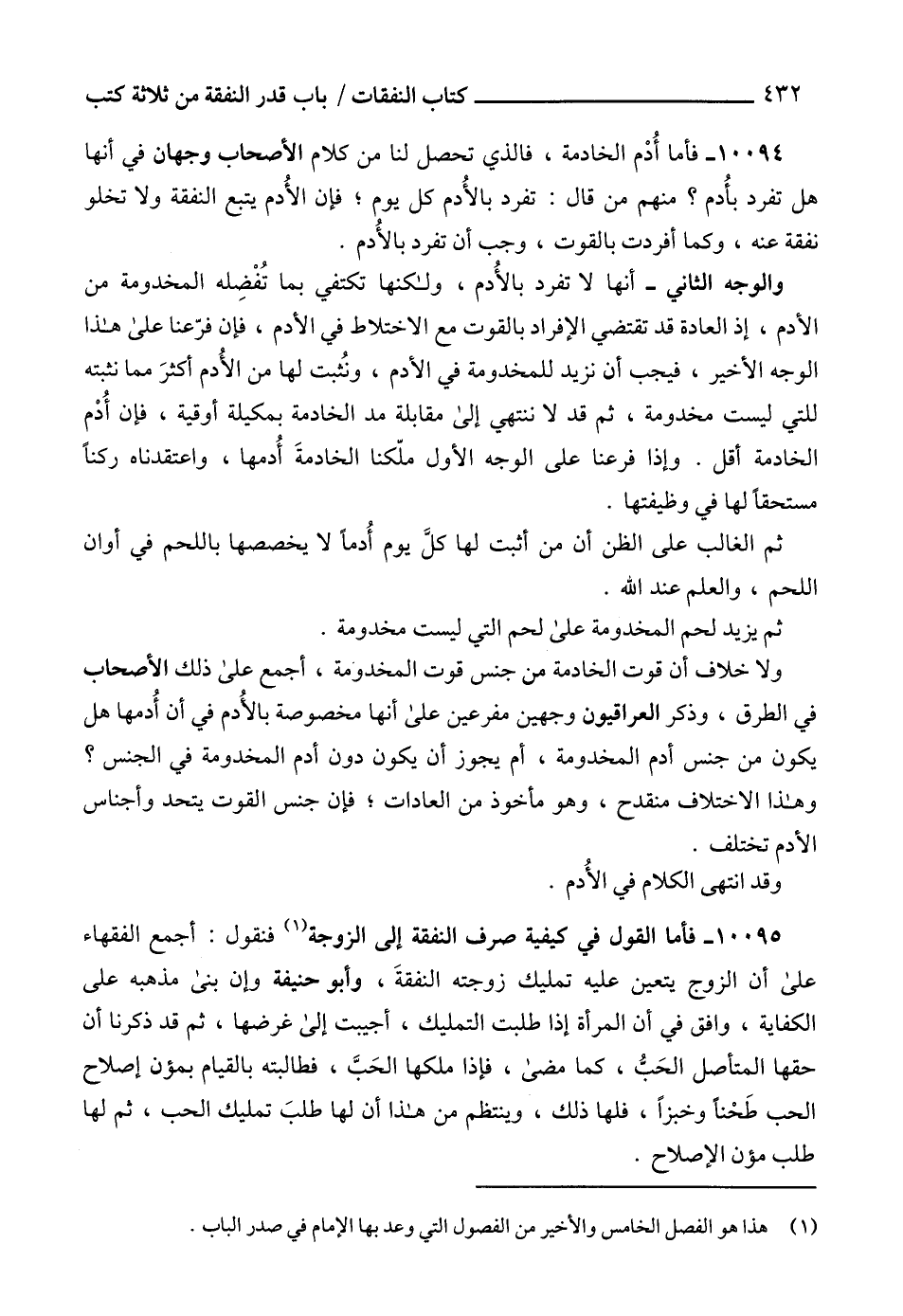 10094 - فأما أُدْم الخادمة، فالذي تحصل لنا من كلام الأصحاب وجهان في أنها هل تفرد بأُدم؟ منهم من قال: تفرد بالأُدم كل يوم؛ فإن الأُدم يتبع النفقة ولا تخلو نفقة عنه، وكما أفردت بالقوت، وجب أن تفرد بالأُدم.