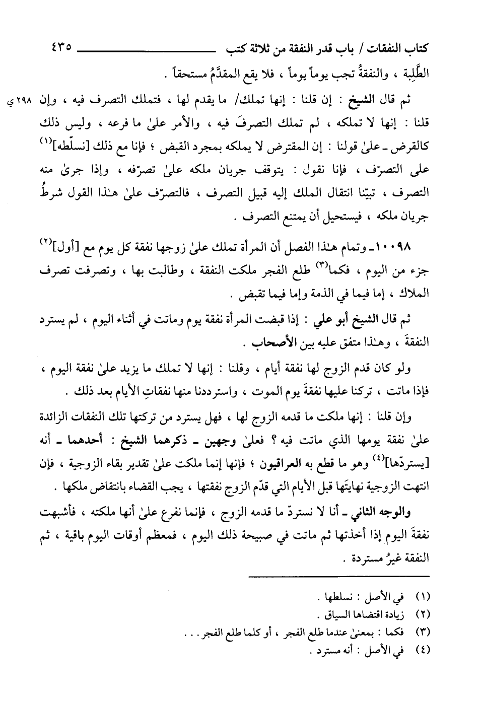 10098 - وتمام هذا الفصل أن المرأة تملك على زوجها نفقة كل يوم مع [أول] (2) جزء من اليوم، فكما (3) طلع الفجر ملكت النفقة، وطالبت بها، وتصرفت تصرف الملاك، إما فيما في الذمة وإما فيما تقبض.