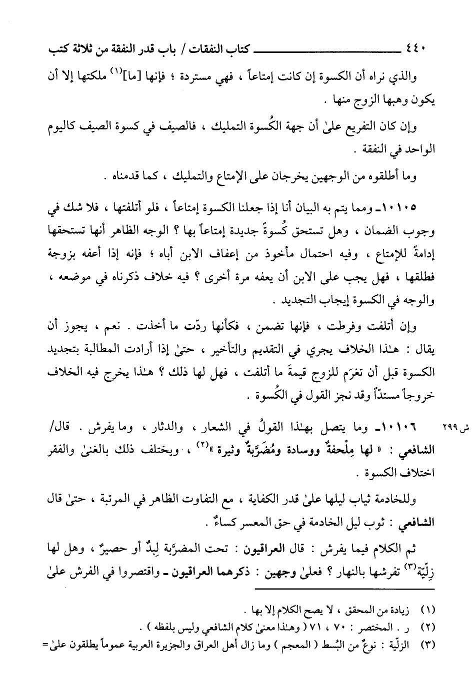 10105 - ومما يتم به البيان أنا إذا جعلنا الكسوة إمتاعاً، فلو أتلفتها، فلا شك في وجوب الضمان، وهل تستحق كُسوةً جديدة إمتاعاً بها؟ الوجه الظاهر أنها تستحقها إدامةً للإمتاع، وفيه احتمال مأخوذ من إعفاف الابن أباه؛ فإنه إذا أعفه بزوجة فطلقها، فهل يجب على الابن أن يعفه مرة أخرى؟ فيه خلاف ذكرناه في موضعه، والوجه في الكسوة إيجاب التجديد.