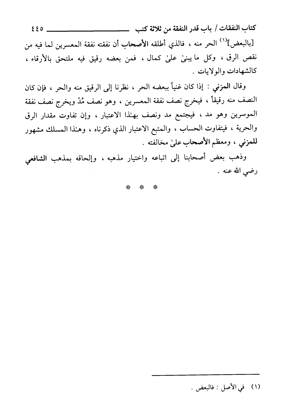 وقال المزني: إذا كان غنياً ببعضه الحر، نظرنا إلى الرقيق منه والحر، فإن كان النصف منه رفيقاً، فيخرج نصف نفقة المعسرين، وهو نصف مُدّ ويخرج نصف نفقة الموسرين وهو مد، فيجتمع مد ونصف بهذا الاعتبار، وإن تفاوت مقدار الرق والحرية، فيتفاوت الحساب، والمتبع الاعتبار الذي ذكرناه، وهذا المسلك مشهور للمزني، ومعظم الأصحاب على مخالفته.