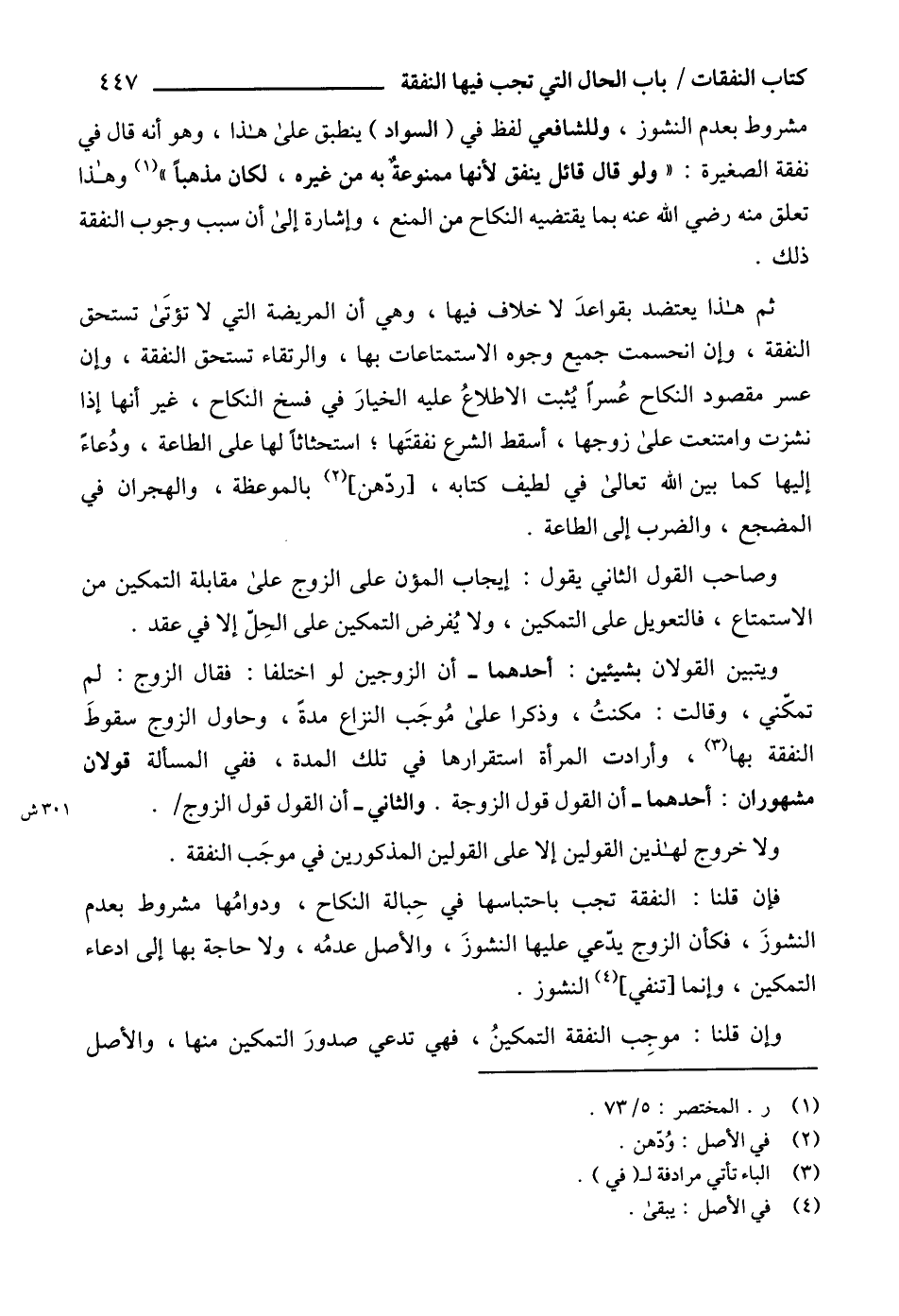 مشروط بعدم النشوز، وللشافعي لفظ في (السواد) ينطبق على هذا، وهو أنه قال في نفقة الصغيرة: " ولو قال قائل ينفق لأنها ممنوعةٌ به من غيره، لكان مذهباً " (1) وهذا تعلق منه رضي الله عنه بما يقتضيه النكاح من المنع، وإشارة إلى أن سبب وجوب النفقة ذلك.