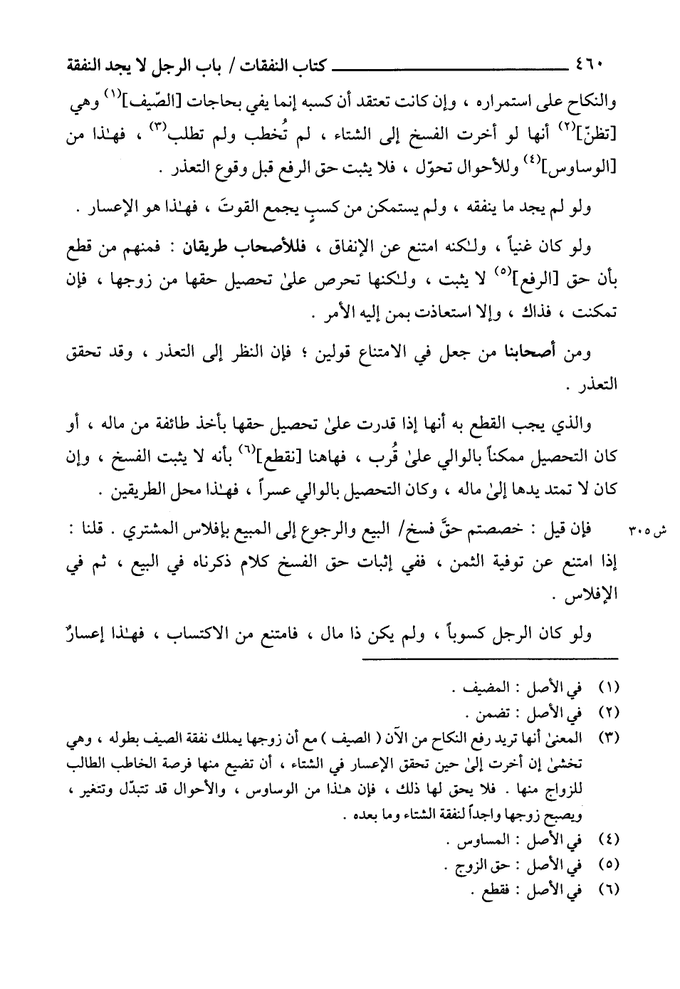 (3) المعنى أنها تريد رفع النكاح من الآن (الصيف) مع أن زوجها يملك نفقة الصيف بطوله، وهي تخشى إن أخرت إلى حين تحقق الإعسار في الشتاء، أن تضيع منها فرصة الخاطب الطالب للزواج منها. فلا يحق لها ذلك، فإن هذا من الوساوس، والأحوال قد تتبدّل وتتغير، ويصبح زوجها واجداً لنفقة الشتاء وما بعده.