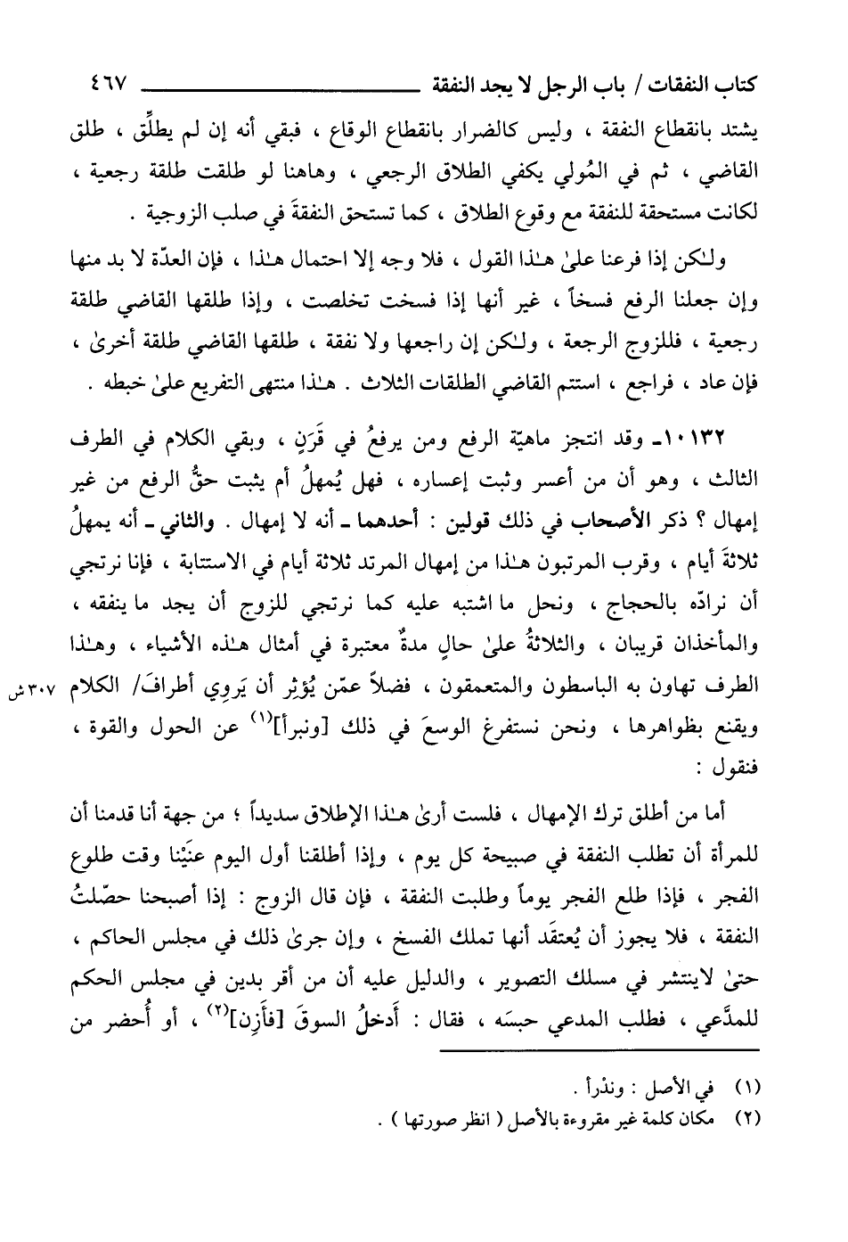 10132 - وقد انتجز ماهيّة الرفع ومن يرفعُ في قَرَنٍ، وبقي الكلام في الطرف الثالث، وهو أن من أعسر وثبت إعساره، فهل يُمهلُ أم يثبت حقُّ الرفع من غير إمهال؟ ذكر الأصحاب في ذلك قولين: أحدهما - أنه لا إمهال. والثاني - أنه يمهلُ ثلاثةَ أيام، وقرب المرتبون هذا من إمهال المرتد ثلاثة أيام في الاستتابة، فإنا نرتجي أن نرادّه بالحجاج، ونحل ما اشتبه عليه كما نرتجي للزوج أن يجد ما ينفقه، والمأخذان قريبان، والثلاثةُ على حالٍ مدةٌ معتبرة في أمثال هذه الأشياء، وهذا الطرف تهاون به الباسطون والمتعمقون، فضلاً عمّن يُؤثرِ أن يَروِي أطرافَ الكلام