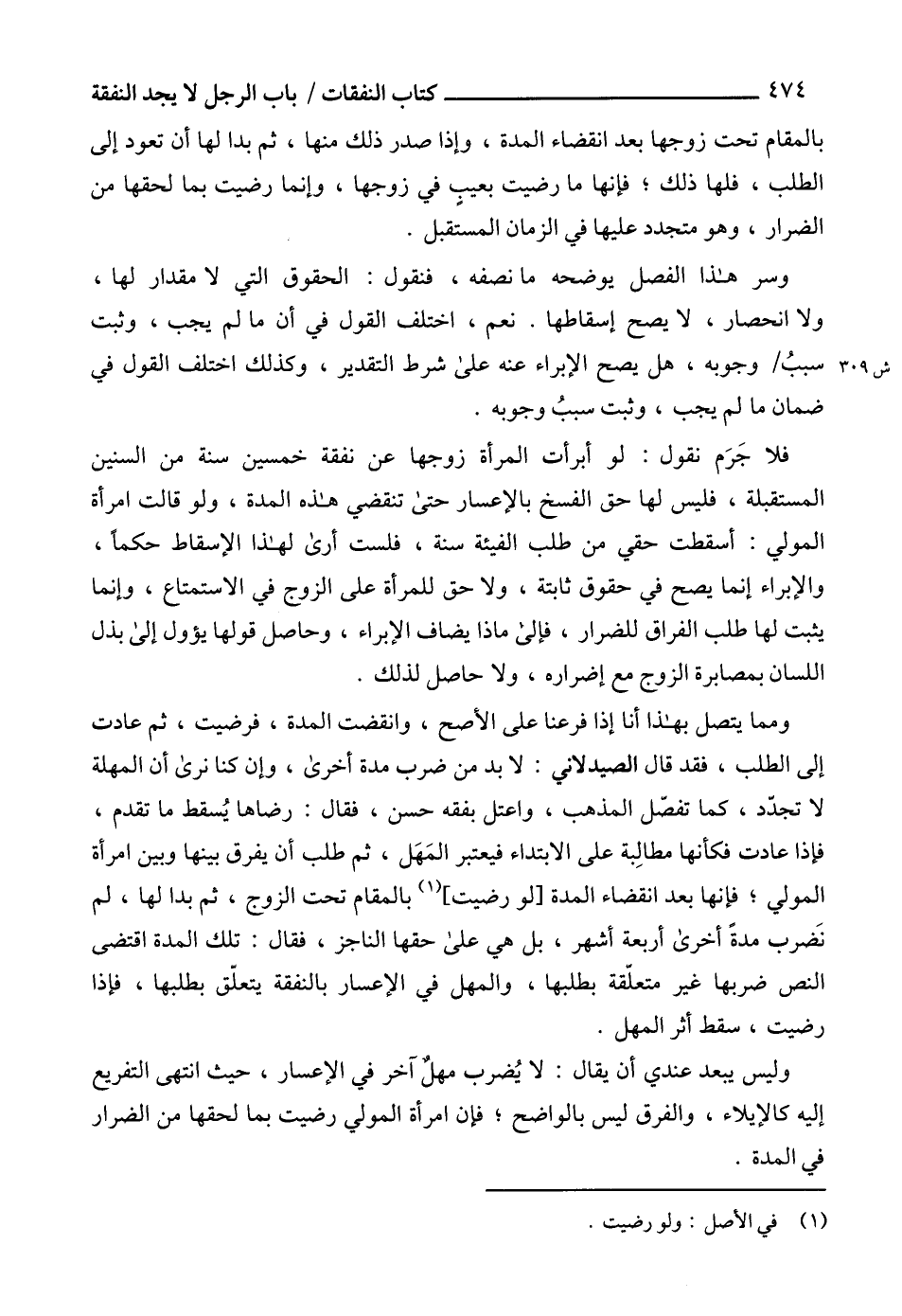 ومما يتصل بهذا أنا إذا فرعنا على الأصح، وانقضت المدة، فرضيت، ثم عادت إلى الطلب، فقد قال الصيدلاني: لا بد من ضرب مدة أخرى، وإن كنا نرى أن المهلة لا تجدّد، كما تفصّل المذهب، واعتل بفقه حسن، فقال: رضاها يُسقط ما تقدم، فإذا عادت فكأنها مطالِبة على الابتداء فيعتبر المَهَل، ثم طلب أن يفرق بينها وبين امرأة المولي؛ فإنها بعد انقضاء المدة [لو رضيت] (1) بالمقام تحت الزوج، ثم بدا لها، لم نَضرب مدةً أخرى أربعة أشهر، بل هي على حقها الناجز، فقال: تلك المدة اقتضى النص ضربها غير متعلّقة بطلبها، والمهل في الإعسار بالنفقة يتعلّق بطلبها، فإذا رضيت، سقط أثر المهل.