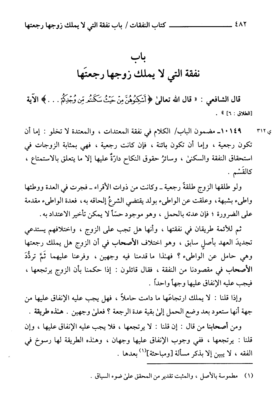 10149 - مضمون الباب الكلام في نفقة المعتدات، والمعتدة لا تخلو: إما أن تكون رجعية، وإما أن تكون بائنة، فإن كانت رجعية، فهي بمثابة الزوجات في استحقاق النفقة والسكنى، وسائرُ حقوق النكاح دارّةٌ عليها إلا ما يتعلق بالاستمتاع، كالقَسْم.