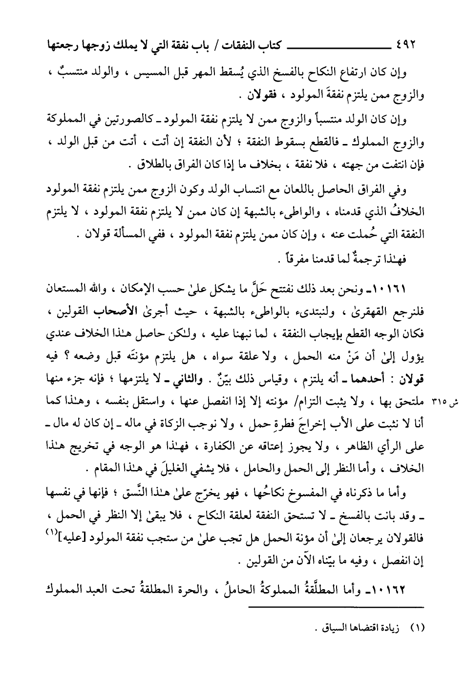 10161 - ونحن بعد ذلك نفتتح حَلَّ ما يشكل على حسب الإمكان، والله المستعان فلنرجع القهقرى، ولنبتدىء بالواطىء بالشبهة، حيث أجرى الأصحاب القولين، فكان الوجه القطع بيجاب النفقة، لما نبهنا عليه، ولكن حاصل هذا الخلاف عندي يؤول إلى أن مَنْ منه الحمل، ولا علقة سواه، هل يلتزم مؤنتَه قبل وضعه؟ فيه قولان: أحدهما - أنه يلتزم، وقياس ذلك بيّنٌ. والثاني - لا يلتزمها؛ فإنه جزء منها ملتحق بها، ولا يثبت التزام مؤنته إلا إذا انفصل عنها، واستقل بنفسه، وهذا كما أنا لا نثبت على الأب إخراجَ فطرةِ حمل، ولا نوجب الزكاة في ماله -إن كان له مال- على الرأي الظاهر، ولا يجوز إعتاقه عن الكفارة، فهذا هو الوجه في تخريج هذا الخلاف، وأما النظر إلى الحمل والحامل، فلا يشفي الغليلَ في هذا المقام.