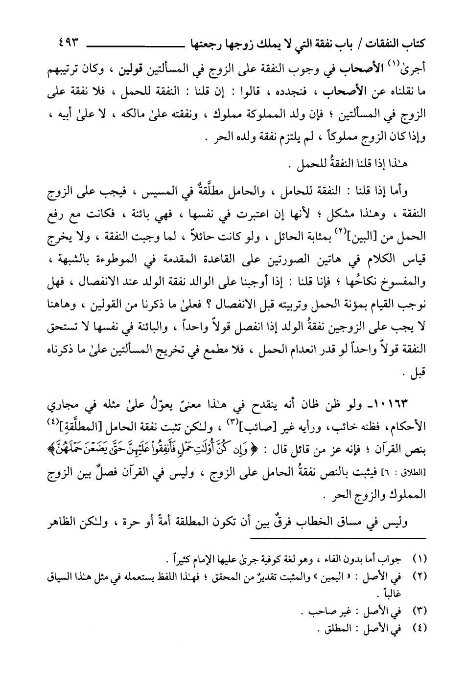10163 - ولو ظن ظان أنه ينقدح في هذا معنىً يعوّلُ على مثله في مجاري الأحكام، فظنه خائب، ورأيه غير [صائب] (3)، ولكن تثبت نفقة الحامل [المطلَّقةِ] (4) بنص القرآن؛ فإنه عز من قائل قال: {وَإِنْ كُنَّ أُولَاتِ حَمْلٍ فَأَنْفِقُوا عَلَيْهِنَّ حَتَّى يَضَعْنَ حَمْلَهُنَّ} [الطلاق: 6]، فيثبت بالنص نفقةُ الحامل على الزوج، وليس في القرآن فصلٌ بين الزوج المملوك والزوج الحر.