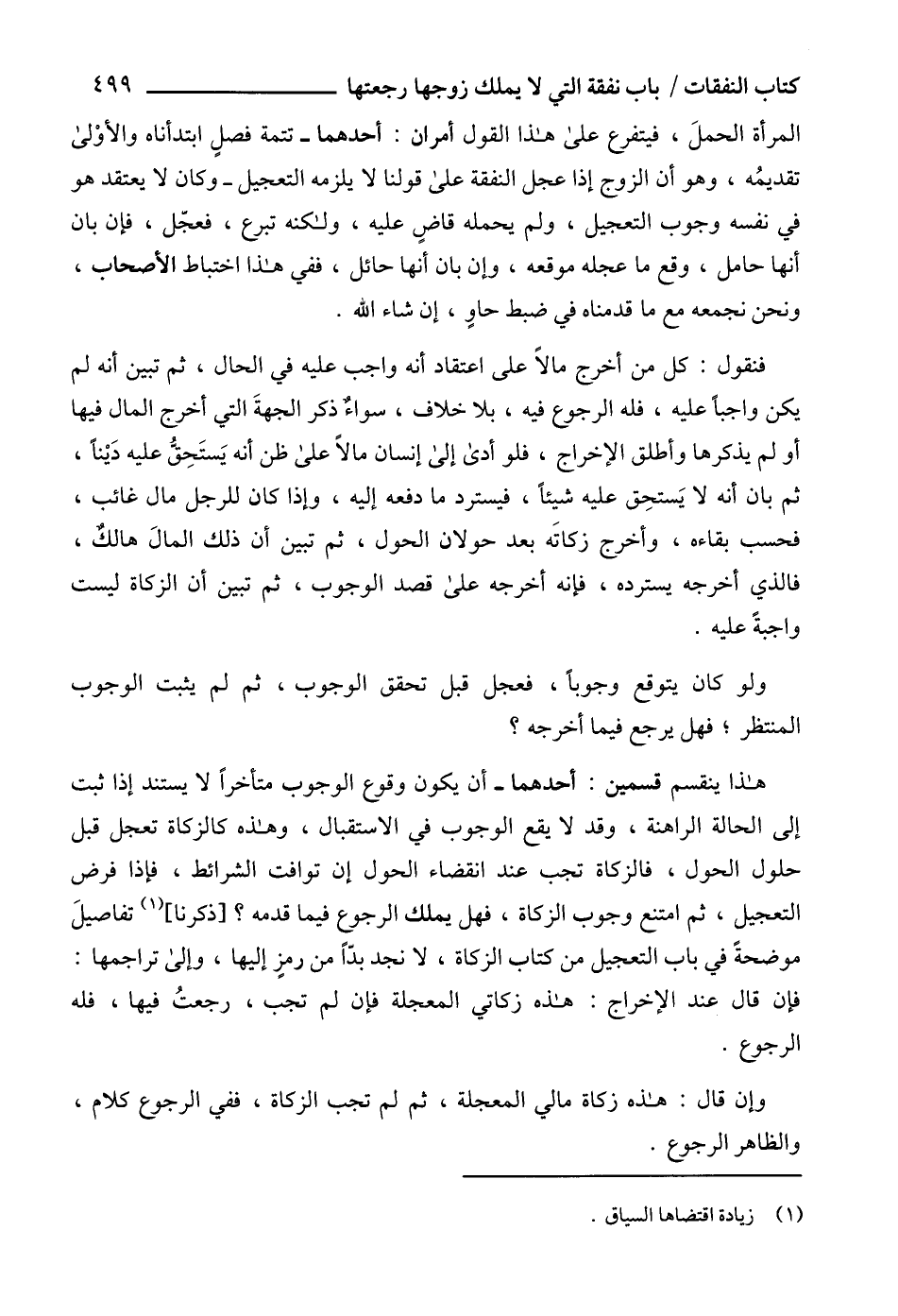 هذا ينقسم قسمين: أحدهما - أن يكون وقوع الوجوب متأخراً لا يستند إذا ثبت إلى الحالة الراهنة، وقد لا يقع الوجوب في الاستقبال، وهذه كالزكاة تعجل قبل حلول الحول، فالزكاة تجب عند انقضاء الحول إن توافت الشرائط، فإذا فرض التعجيل، ثم امتنع وجوب الزكاة، فهل يملك الرجوع فيما قدمه؟ [ذكرنا] (1) تفاصيلَ موضحةً في باب التعجيل من كتاب الزكاة، لا نجد بدّاً من رمزٍ إليها، وإلى تراجمها: فإن قال عند الإخراج: هذه زكاتي المعجلة فإن لم تجب، رجعتُ فيها، فله الرجوع.