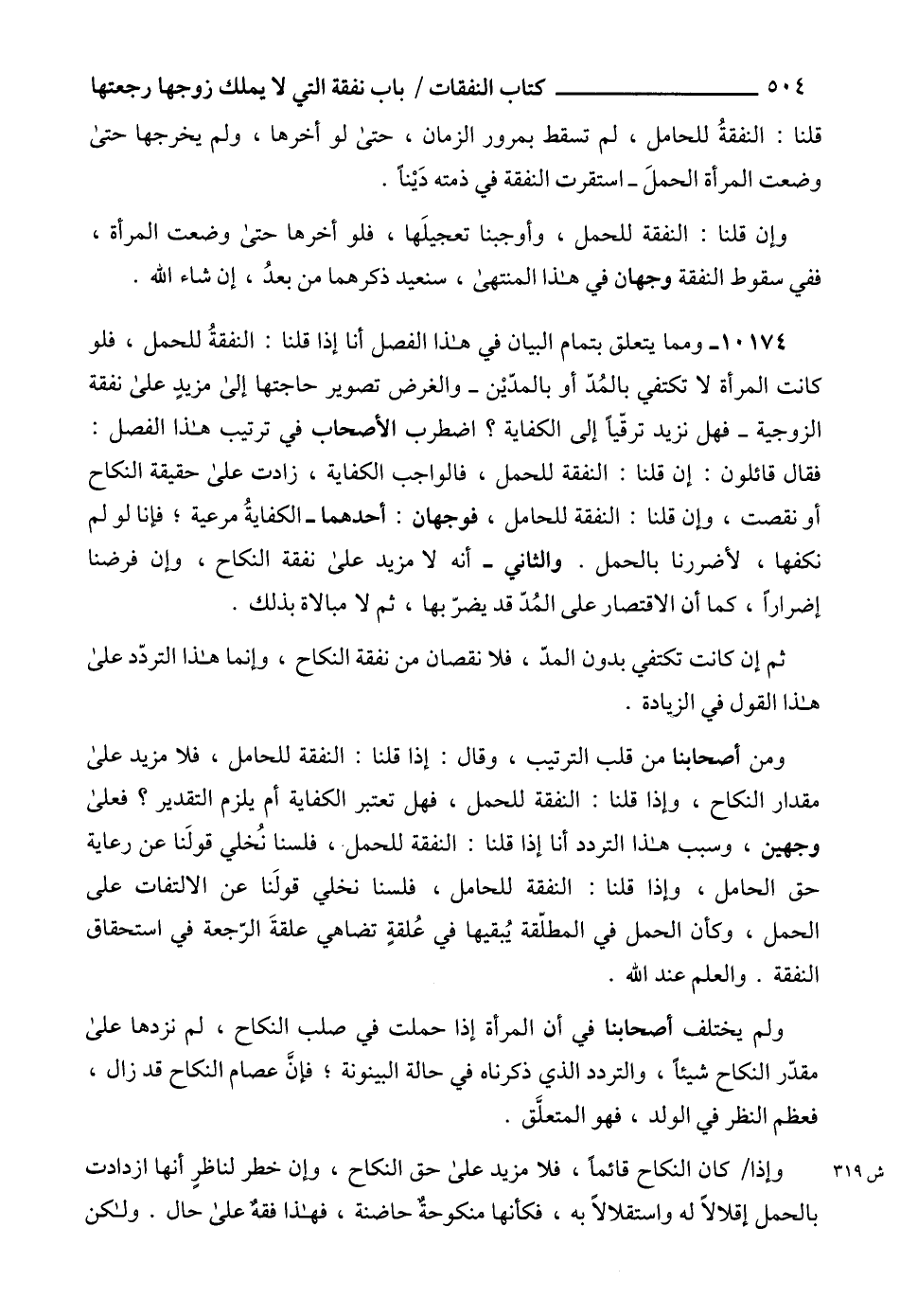 10174 - ومما يتعلق بتمام البيان في هذا الفصل أنا إذا قلنا: النفقةُ للحمل، فلو كانت المرأة لا تكتفي بالمُدّ أو بالمدّيْن -والغرض تصوير حاجتها إلى مزيدٍ على نفقة الزوجية- فهل نزيد ترقّياً إلى الكفاية؟ اضطرب الأصحاب في ترتيب هذا الفصل: فقال قائلون: إن قلنا: النفقة للحمل، فالواجب الكفاية، زادت على حقيقة النكاح أو نقصت، وإن قلنا: النفقة للحامل، فوجهان: أحدهما - الكفايةُ مرعية، فإنا لو لم نكفها، لأضررنا بالحمل. والثاني - أنه لا مزيد على نفقة النكاح، وإن فرضنا إضراراً، كما أن الاقتصار على المُدّ قد يضرّ بها، ثم لا مبالاة بذلك.