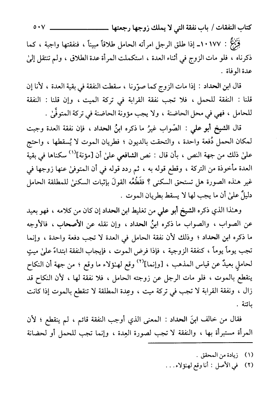 قال الشيخ أبو علي: الصّواب غيرُ ما ذكره ابنُ الحداد، فإن نفقة العدة وجبت لمكان الحمل دُفعة واحدة، والتحقت بالديون؛ فطريان الموت لا يُسقطها، واحتج على ذلك من جهة النص، بأن قال: نص الشافعي على أن [مؤنة] (1) سكناها في بقية العدة مأخوذة من التركة، وقطع قوله به، ثم ردد قوله في أن المتوفى عنها زوجها في غير هذه الصورة هل تستحق السكنى؟ فقَطْعُه القولَ بإثبات السكنى للمطلقة الحامل دليلٌ على أن ما يجب لها لا يسقط بطريان الموت.