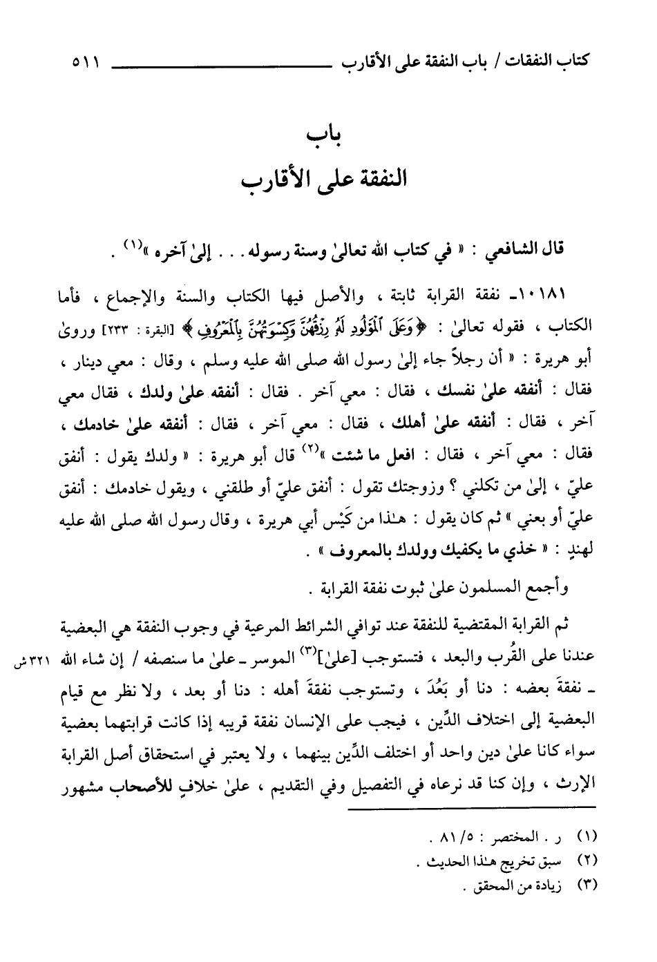 10181 - نفقة القرابة ثابتة، والأصل فيها الكتاب والسنة والإجماع، فأما الكتاب، فقوله تعالى: {وَعَلَى الْمَوْلُودِ لَهُ رِزْقُهُنَّ وَكِسْوَتُهُنَّ بِالْمَعْرُوفِ} [البقرة: 233] وروى أبو هريرة: " أن رجلاً جاء إلى رسول الله صلى الله عليه وسلم، وقال: معي دينار، فقال: أنفقه على نفسك، فقال: معي آخر. فقال: أنفقه على ولدك، فقال معي آخر، فقال: أنفقه على أهلك، فقال: معي آخر، فقال: أنفقه على خادمك، فقال: معي آخر، فقال: افعل ما شئت " (2) قال أبو هريرة: " ولدك يقول: أنفق عليّ، إلى من تكلني؟ وزوجتك تقول: أنفق عليّ أو طلقني، ويقول خادمك: أنفق