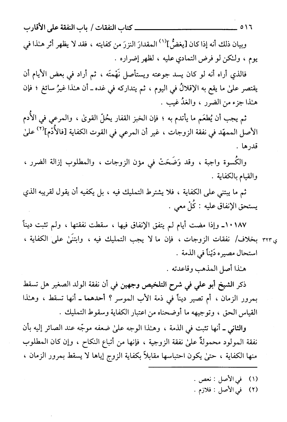 10187 - وإذا مضت أيام لم يتفق الإنفاق فيها، سقطت نفقتها، ولم تثبت ديناً بخلاف نفقات الزوجات، فإن ما لا يجب التمليك فيه، وابتنَى على الكفاية، استحال مصيره دَيْناً في الذمة.