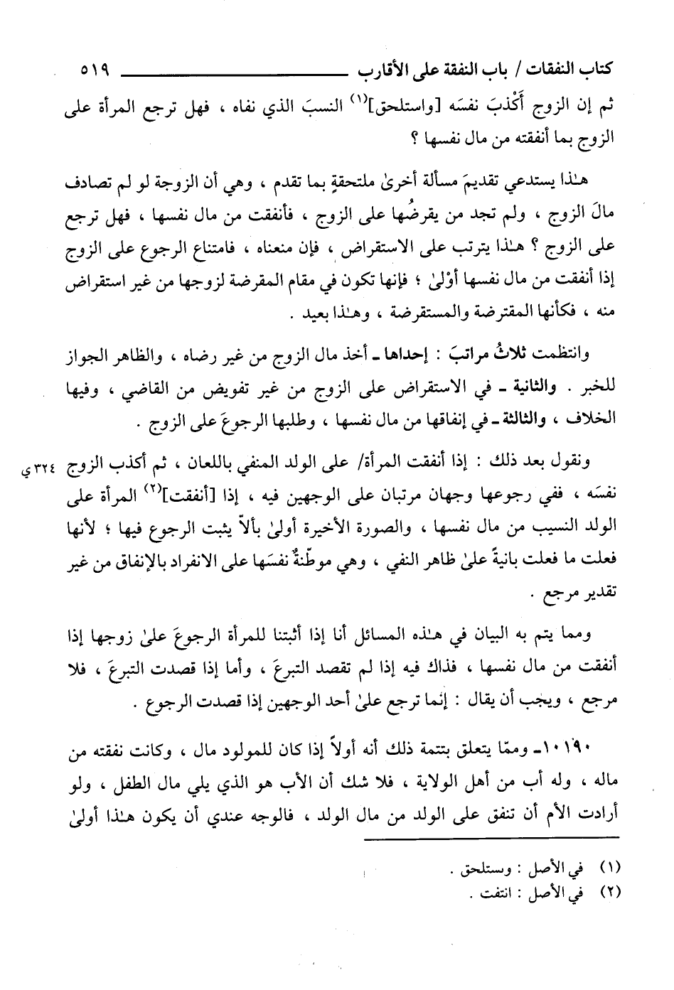 وانتظمت ثلاثُ مراتبَ: إحداها - أخذ مال الزوج من غير رضاه، والظاهر الجواز للخبر. والثانية - في الاستقراض على الزوج من غير تفويض من القاضي، وفيها الخلاف، والثالثة - في إنفاقها من مال نفسها، وطلبها الرجوعَ على الزوج.