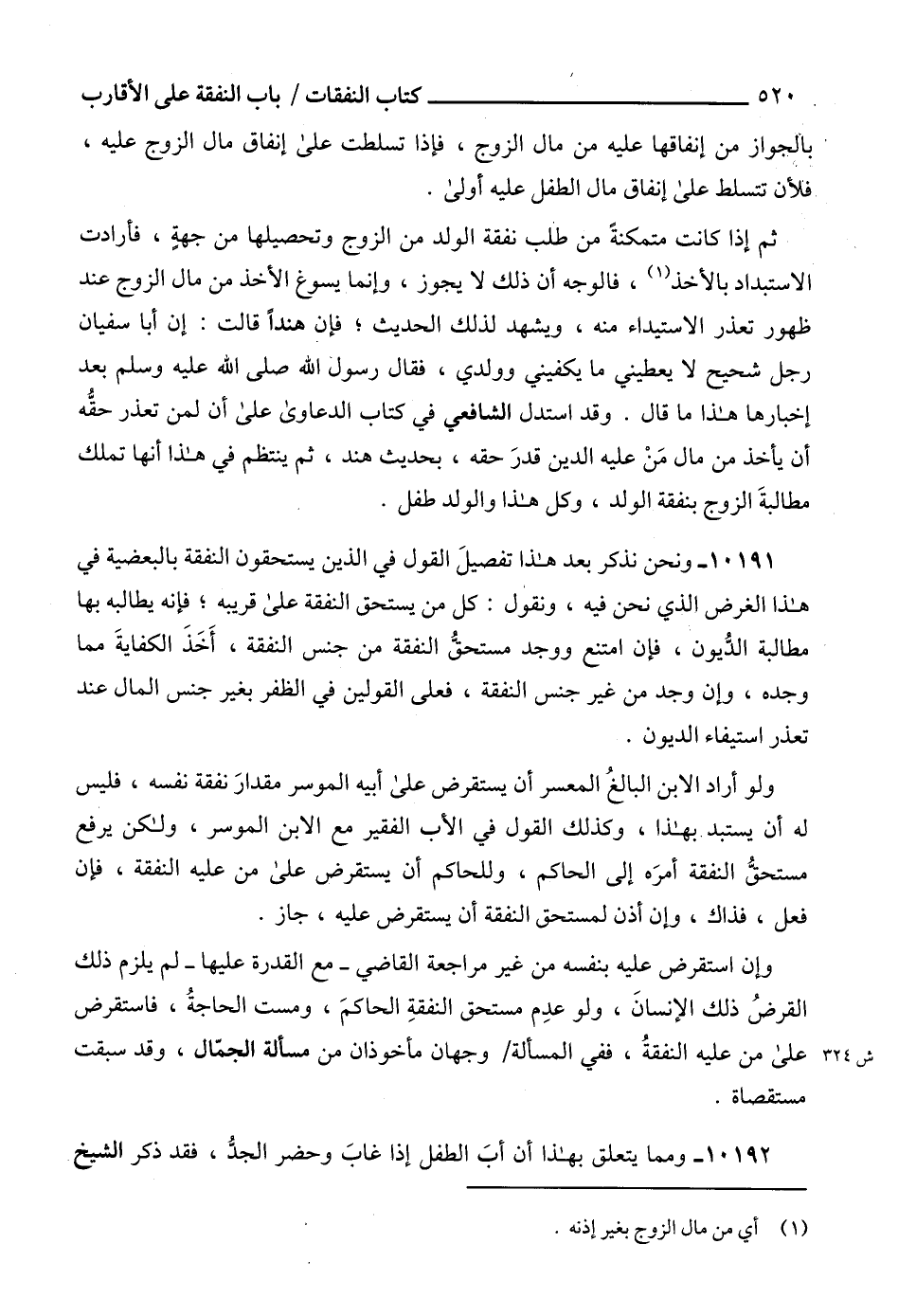 10191 - ونحن نذكر بعد هذا تفصيلَ القول في الذين يستحقون النفقة بالبعضية في هذا الغرض الذي نحن فيه، ونقول: كل من يستحق النفقة على قريبه؛ فإنه يطالبه بها مطالبة الدُّيون، فإن امتنع ووجد مستحقُّ النفقة من جنس النفقة، أَخَذَ الكفايةَ مما وجده، وإن وجد من غير جنس النفقة، فعلى القولين في الظفر بغير جنس المال عند تعذر استيفاء الديون.