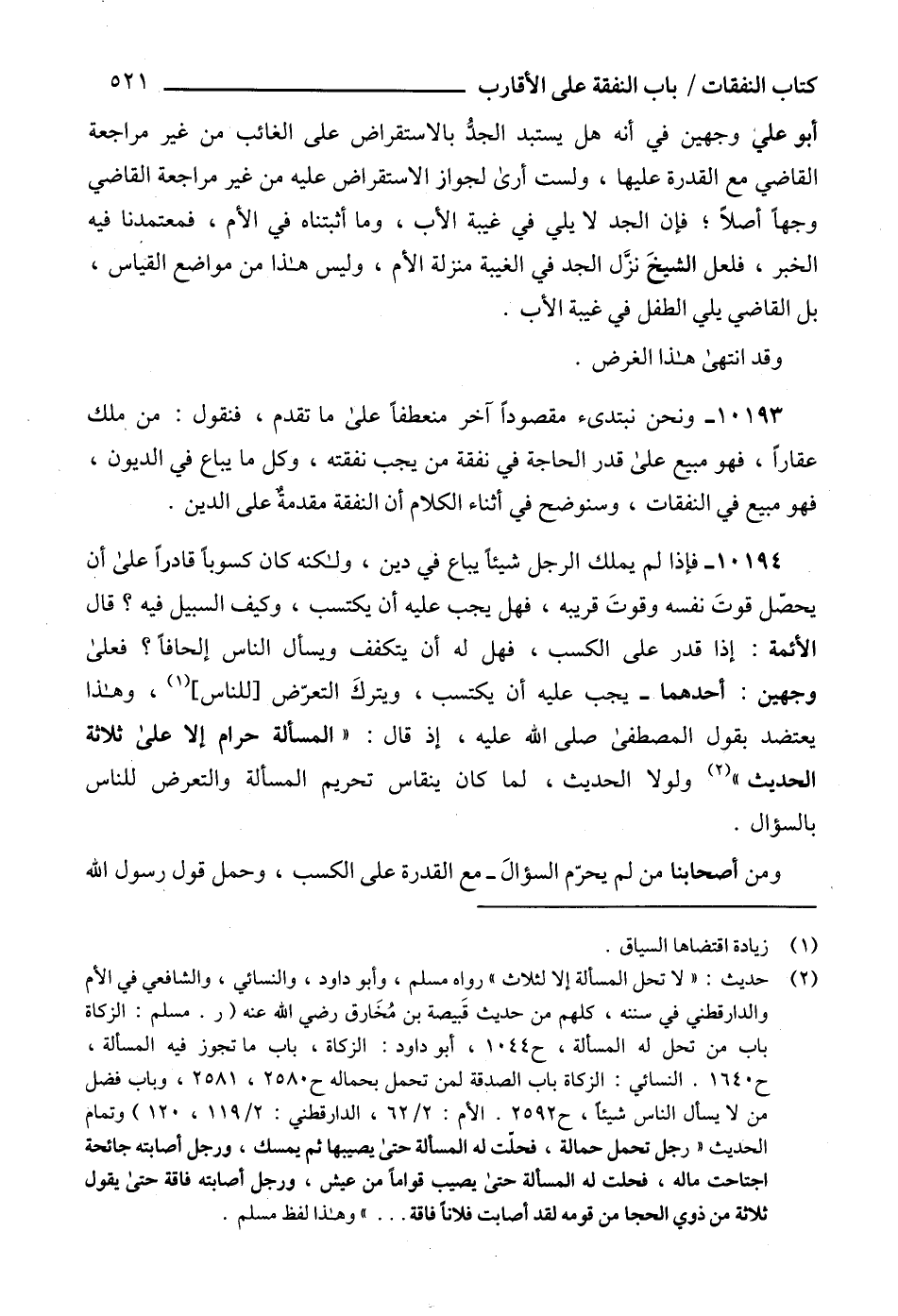 10194 - فإذا لم يملك الرجل شيئاًً يباع في دين، ولكنه كان كسوباً قادراً على أن يحصّل قوتَ نفسه وقوتَ قريبه، فهل يجب عليه أن يكتسب، وكيف السبيل فيه؟ قال الأئمة: إذا قدر على الكسب، فهل له أن يتكفف ويسال الناس إلحافاً؟ فعلى وجهين: أحدهما - يجب عليه أن يكتسب، ويتركَ التعرّض [للناس] (1)، وهذا يعتضد بقول المصطفى صلى الله عليه، إذ قال: " المسألة حرام إلا على ثلاثة الحديث " (2) ولولا الحديث، لما كان ينقاس تحريم المسألة والتعرض للناس بالسؤال.