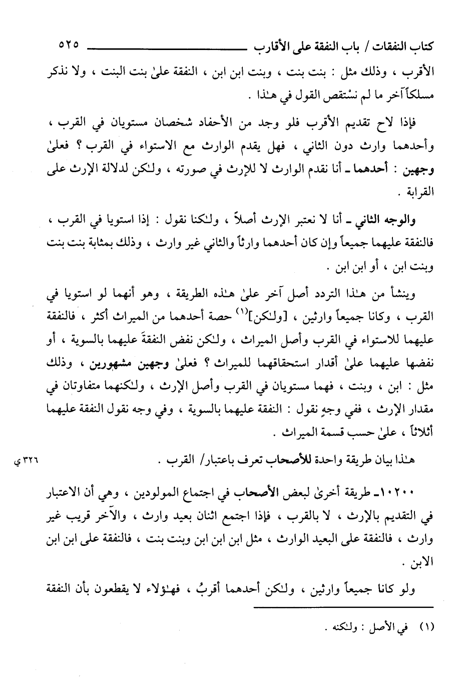 10200 - طريقة أخرى لبعض الأصحاب في اجتماع المولودين، وهي أن الاعتبار في التقديم بالإرث، لا بالقرب، فإذا اجتمع اثنان بعيد وارث، والآخر قريب غير وارث، فالنفقة على البعيد الوارث، مثل ابن ابن ابن وبنت بنت، فالنفقة على ابن ابن الابن.