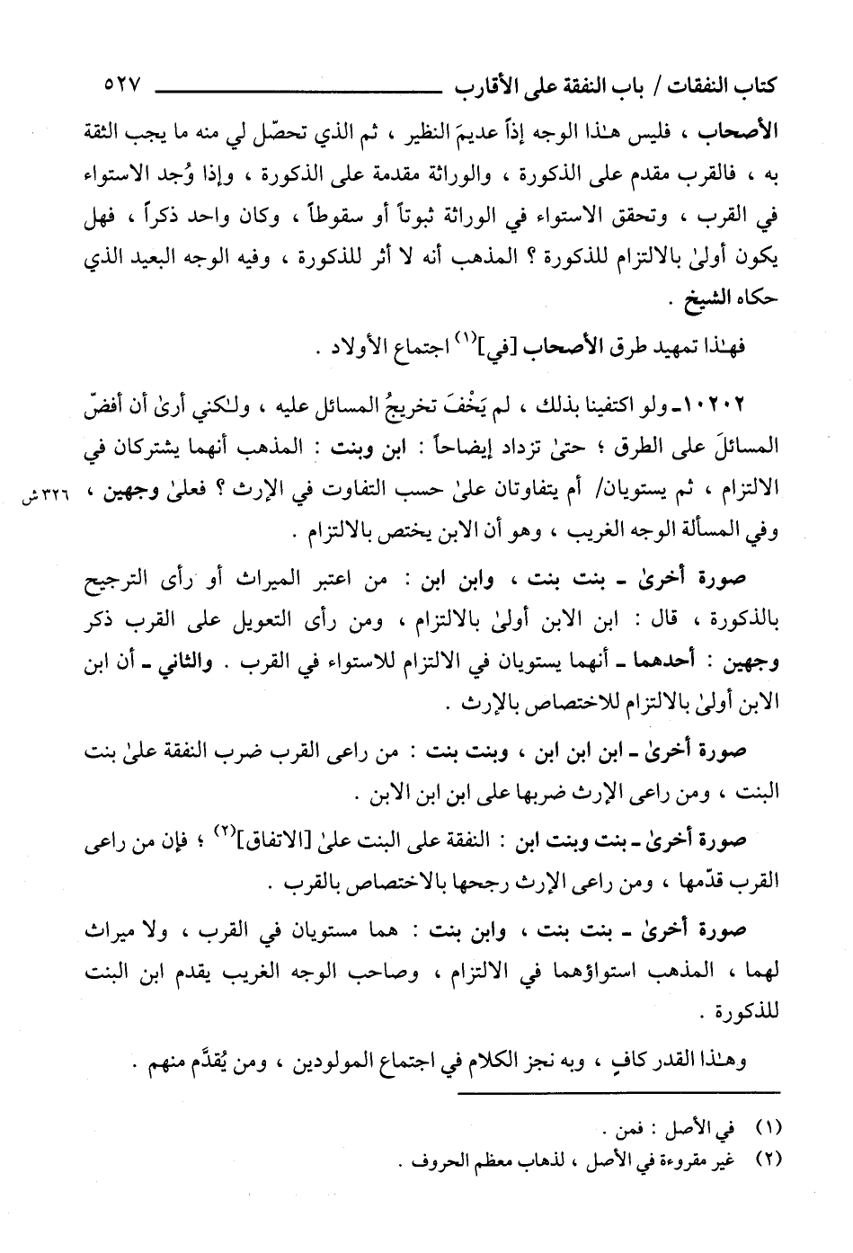 10202 - ولو اكتفينا بذلك، لم يَخْفَ تخريجُ المسائل عليه، ولكني أرى أن أفضّ المسائلَ على الطرق؛ حتى تزداد إيضاحاً: ابن وبنت: المذهب أنهما يشتركان في الالتزام، ثم يستويان أم يتفاوتان على حسب التفاوت في الإرث؟ فعلى وجهين، وفي المسألة الوجه الغريب، وهو أن الابن يختص بالالتزام.
