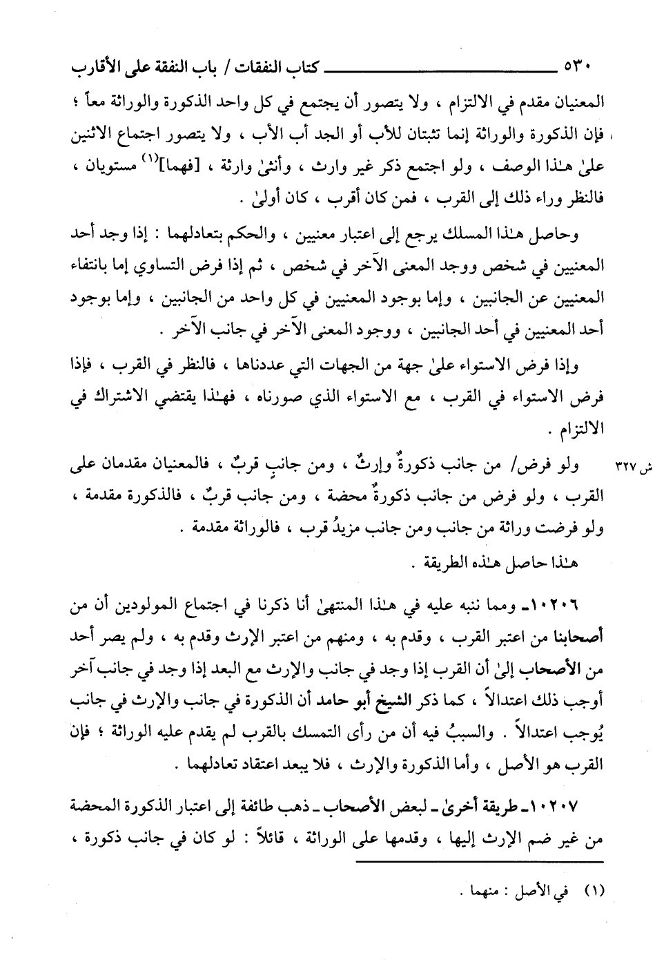 10207 - طريقة أخرى - لبعض الأصحاب- ذهب طائفة إلى اعتبار الذكورة المحضة من غير ضم الإرث إليها، وقدمها على الوراثة، قائلاً: لو كان في جانب ذكورة،