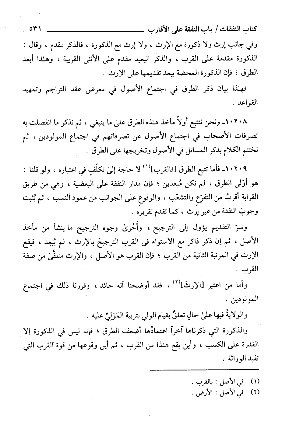 10209 - فأما تتبع الطرق [فالقرب] (1) لا حاجة إلى تكلّفٍ في اعتباره، ولو قلنا: هو أوْلى الطرق، لم نكن مُبعدين؛ فإن مدار النفقة على البعضية، وهي من طريق القرابة أقربُ من التفرّعِ والتشعّب، والوقوعِ على الجوانب من عمود النسب، ثم يُثبت وجوبَ النفقة من غير إرث، كما تقدم تقريره.