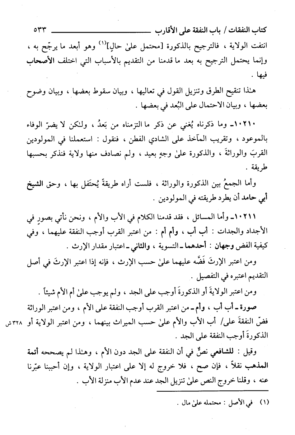 10211 - وأما المسائل، فقد قدمنا الكلام في الأب والأم، ونحن نأتي بصورٍ في الأجداد والجدات: أب أب، وأم أم: من اعتبر القرب أوجب النفقة عليهما، وفي كيفية الفض وجهان: أحدهما - التسوية، والثاني - اعتبار مقدار الإرث.