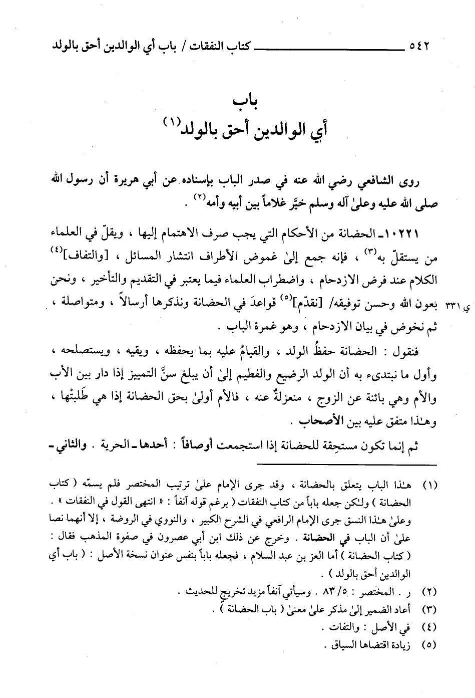(1) هذا الباب يتعلق بالحضانة، وقد جرى الإمام على ترتيب المختصر فلم يسمّه (كتاب الحضانة) ولكن جعله باباً من كتاب النفقات (برغم قوله آنفاً: "انتهى القول في النفقات".