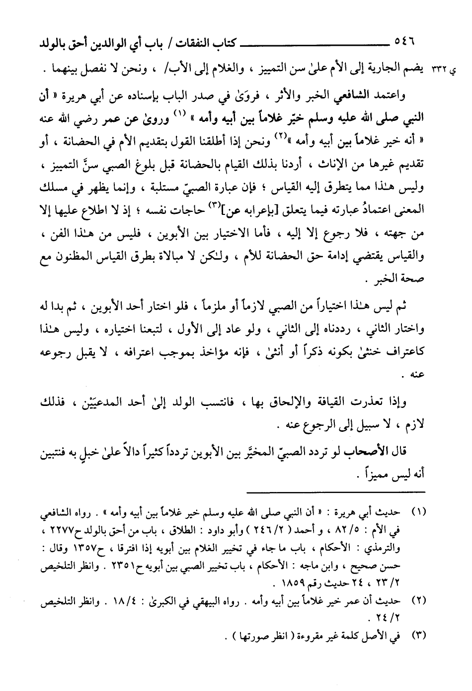 (1) حديث أبي هريرة: "أن النبي صلى الله عليه وسلم خير غلاماً بين أبيه وأمه". رواه الشافعي في الأم: 5/ 82، وأحمد (2/ 246) وأبو داود: الطلاق، باب من أحق بالولد ح 2277، والترمذي: الأحكام، باب ما جاء في تخيير الغلام بين أبويه إذا افترقا، ح 1357 وقال: حسن صحيح، وابن ماجه: الأحكام، باب تخيير الصبي بين أبويه ح 2351. وانظر التلخيص 2/ 23، 24 حديث رقم 1859.
