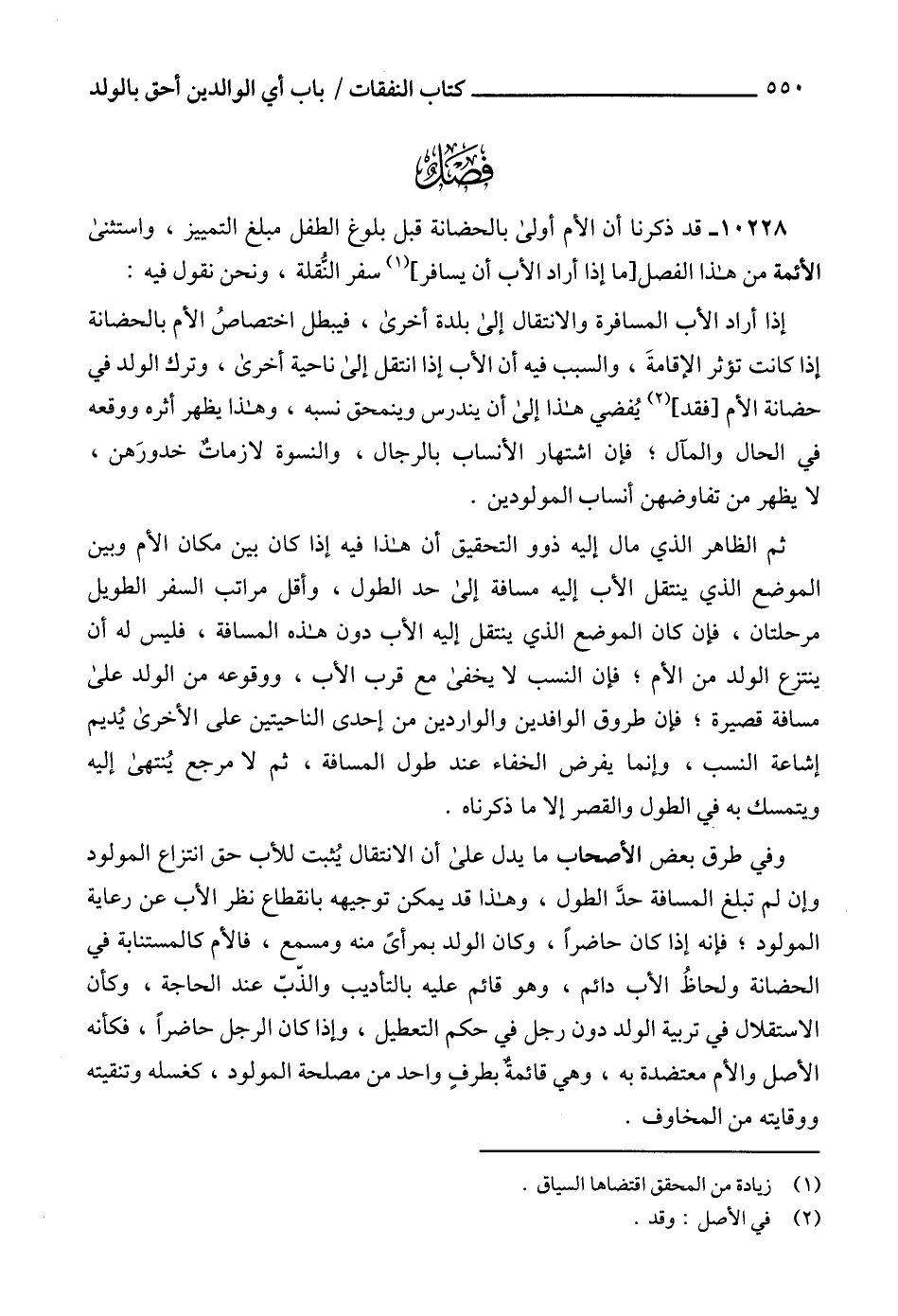 10228 - قد ذكرنا أن الأم أولى بالحضانة قبل بلوغ الطفل مبلغ التمييز، واستثنى الأئمة من هذا الفصل [ما إذا أراد الأب أن يسافر] (1) سفر النُّقلة، ونحن نقول فيه:
