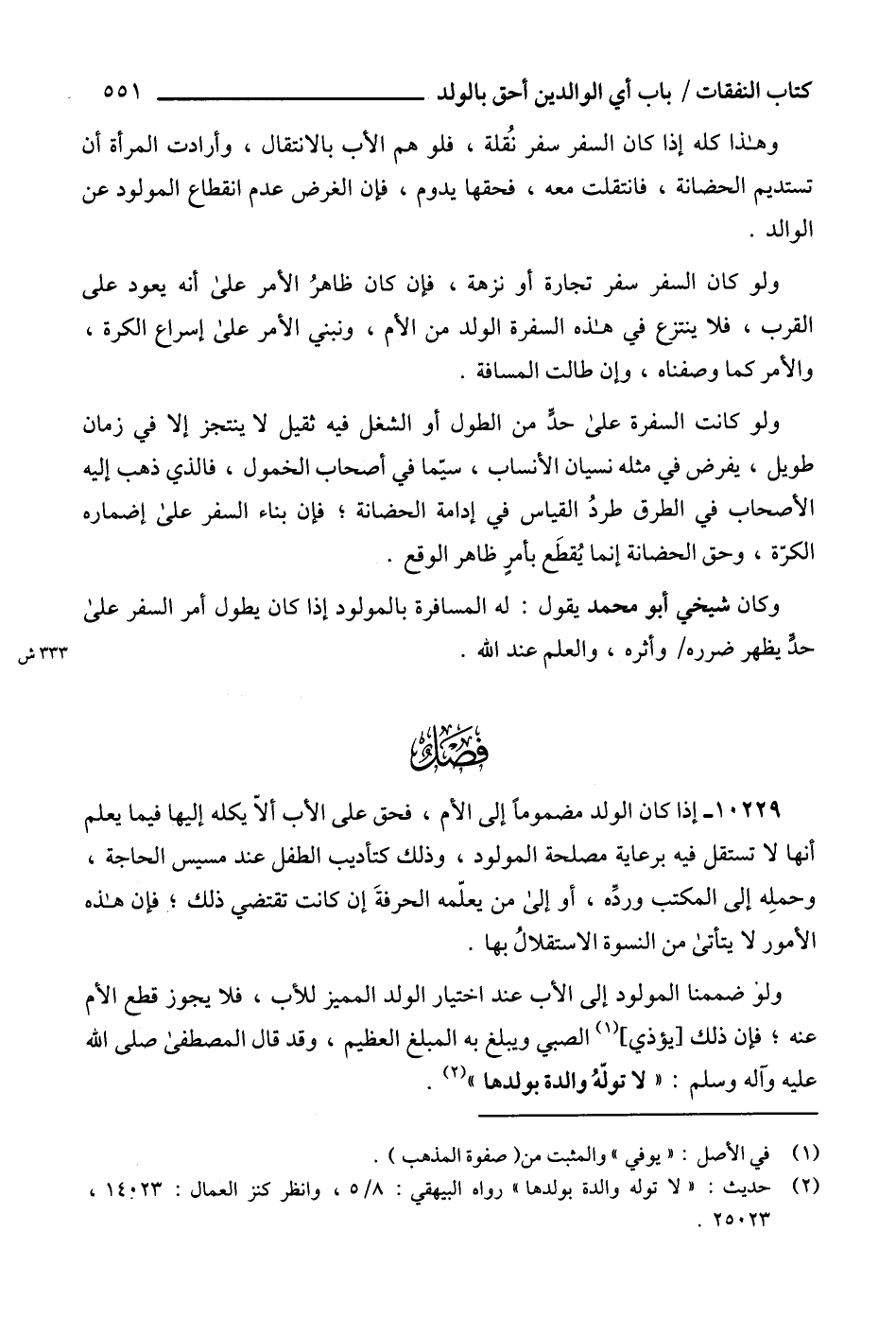 10229 - إذا كان الولد مضموماً إلى الأم، فحق على الأب ألاّ يكله إليها فيما يعلم أنها لا تستقل فيه برعاية مصلحة المولود، وذلك كتأديب الطفل عند مسيس الحاجة، وحملِه إلى المكتب وردِّه، أو إلى من يعلّمه الحرفةَ إن كانت تقتضي ذلك؛ فإن هذه الأمور لا يتأتى من النسوة الاستقلالُ بها.