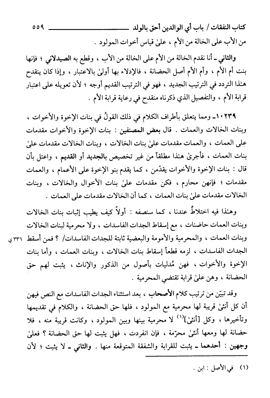 10239 - ومما يتعلق بأطراف الكلام في ذلك القولُ في بنات الإخوة والأخوات، وبنات الخالات والعمات. قال بعض المصنفين: بنات الإخوة والأخوات مقدمات على العمات، والعمات مقدمات على بنات الخالات، وبنات الخالات مقدمات على بنات العمات، فأجرى هذا مطلقاً من غير تخصيص بالجديد أو القديم، واعتل بأن قال: بنات الإخوة والأخوات يقدّمن، كما يقدم بنو الإخوة على الأعمام، والعمات مقدمات؛ فإنهن محارم، فكن مقدمات على بنات الأخوال والخالات، وبنات الخالات مقدمات على بنات العمات، كما أن الخالات مقدمات على العمات.