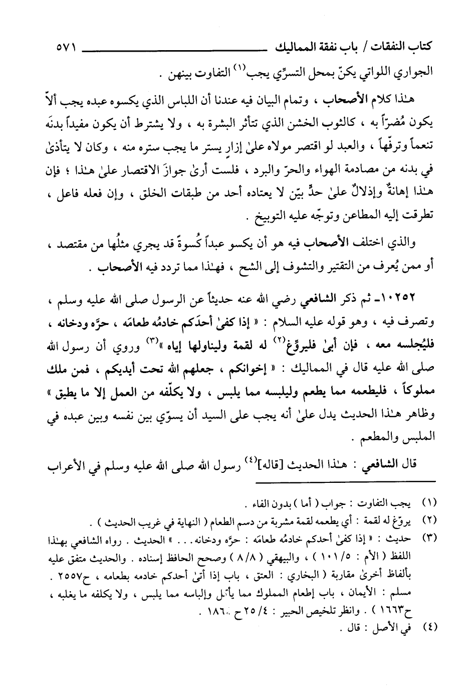 10252 - ثم ذكر الشافعي رضي الله عنه حديثاً عن الرسول صلى الله عليه وسلم، وتصرف فيه، وهو قوله عليه السلام: " إذا كفى أحدَكم خادمُه طعامَه، حرَّه ودخانه، فليُجلسه معه، فإن أبى فليروِّغ (2) له لقمة وليناولها إياه " (3) وروي أن رسول الله صلى الله عليه قال في المماليك: " إخوانكم، جعلهم الله تحت أيديكم، فمن ملك مملوكاً، فليطعمه مما يطعم وليلبسه مما يلبس، ولا يكلّفه من العمل إلا ما يطيق " وظاهر هذا الحديث يدل على أنه يجب على السيد أن يسوّي بين نفسه وبين عبده في الملبس والمطعم.