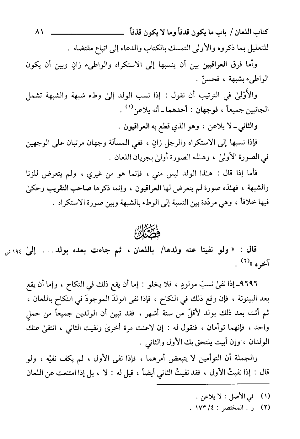 9696 - إذا نفى نسبَ مولودٍ، فلا يخلو: إما أن يقع ذلك في النكاح، وإما أن يقع بعد البينونة، فإن وقع ذلك في النكاح، فإذا نفى الولدَ الموجودَ في النكاح باللعان، ثم أتت بعد ذلك بولد لأقلّ من ستة أشهر، فقد تبين أن الولدين جميعاً من حمل واحد، فإنهما توأمان، فنقول له: إن لاعنت مرة أخرى ونفيت الثاني، انتفى عنك الولدان، وإن أبيت يلتحق بك الأول والثاني.