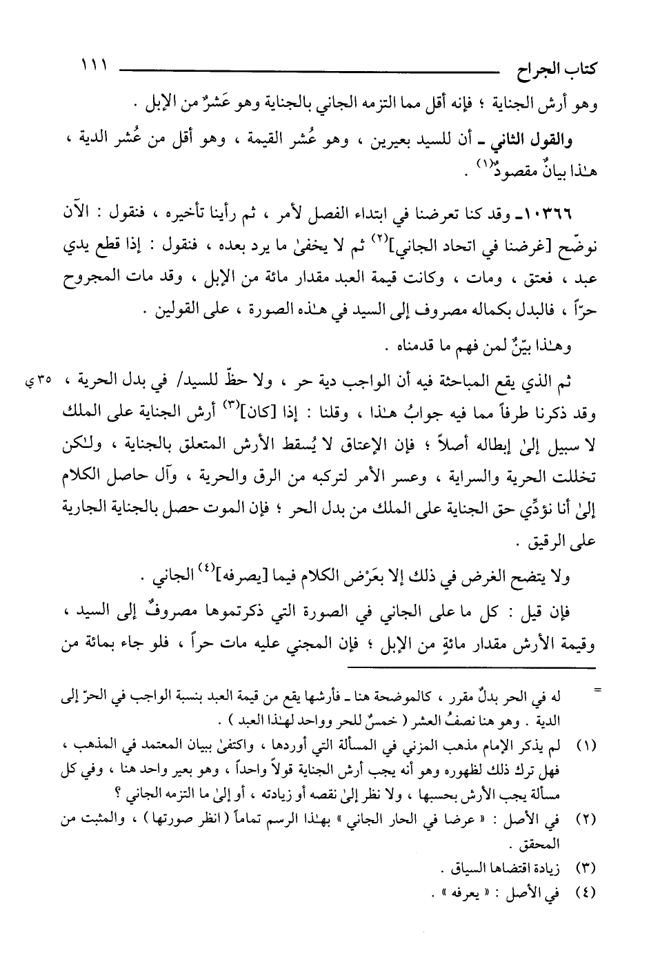 10366 - وقد كنا تعرضنا في ابتداء الفصل لأمر، ثم رأينا تأخيره، فنقول: الآن نوضّح [غرضنا في اتحاد الجاني] (2) ثم لا يخفى ما يرد بعده، فنقول: إذا قطع يدي عبد، فعتق، ومات، وكانت قيمة العبد مقدار مائة من الإبل، وقد مات المجروح حرّاً، فالبدل بكماله مصروف إلى السيد في هذه الصورة، على القولين.