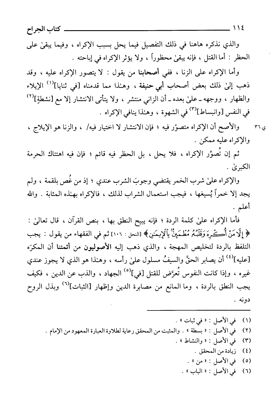فأما الإكراه على كلمة الردة؛ فإنه يبيح النطق بها، بنص القرآن، قال تعالى: {إِلَّا مَنْ أُكْرِهَ وَقَلْبُهُ مُطْمَئِنٌّ بِالْإِيمَان} [النحل: 106] ثم في الفقهاء من يقول: يجب التلفظ بالردة لتخليص المهجة، والذي ذهب إليه الأصوليون من أئمتنا أن المكرَه [عليه] (4) أن يصابر الحقَّ والسيفُ مسلول على رأسه، وهذا هو الذي لا يجوز عندي غيره، وإذا كانت النفوس تُعرَّض للقتل [في] (5) الجهاد، والذب عن الدين، فكيف يجب النطق بالردة، وما المانع من مصابرة الدين وإظهار [الثبات] (6) وبذل الروح دونه.
