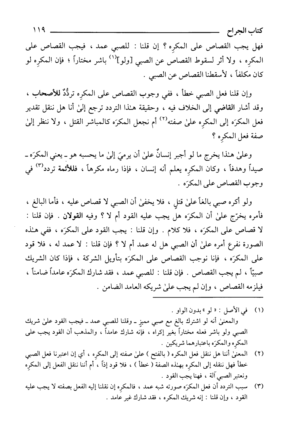 (2) المعنى أننا هل ننقل فعل المكره (بالفتح) على صفته إلى المكرِه، أي إن اعتبرنا فعل الصبي خطأ فهل ننقله إلى المكرِه بهذه الصفة (خطأ)، فلا قود إذاً، أم أننا ننقل الفعل إلى المكرِه ونعتبر الصبي آلة، فهنا يجب القود.