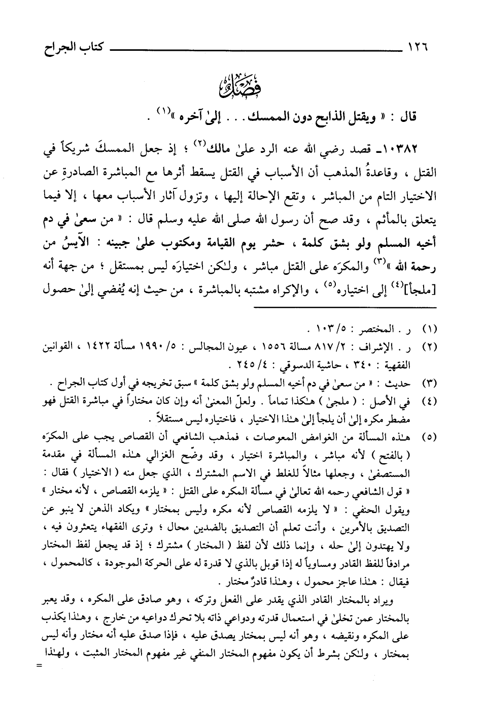 (4) في الأصل: (ملجى) هكذا تماماًً. ولعلّ المعنى أنه وإن كان مختاراً في مباشرة القتل فهو مضطر مكره إلى أن يلجأ إلى هذا الاختيار، فاختياره ليس مستقلاً.