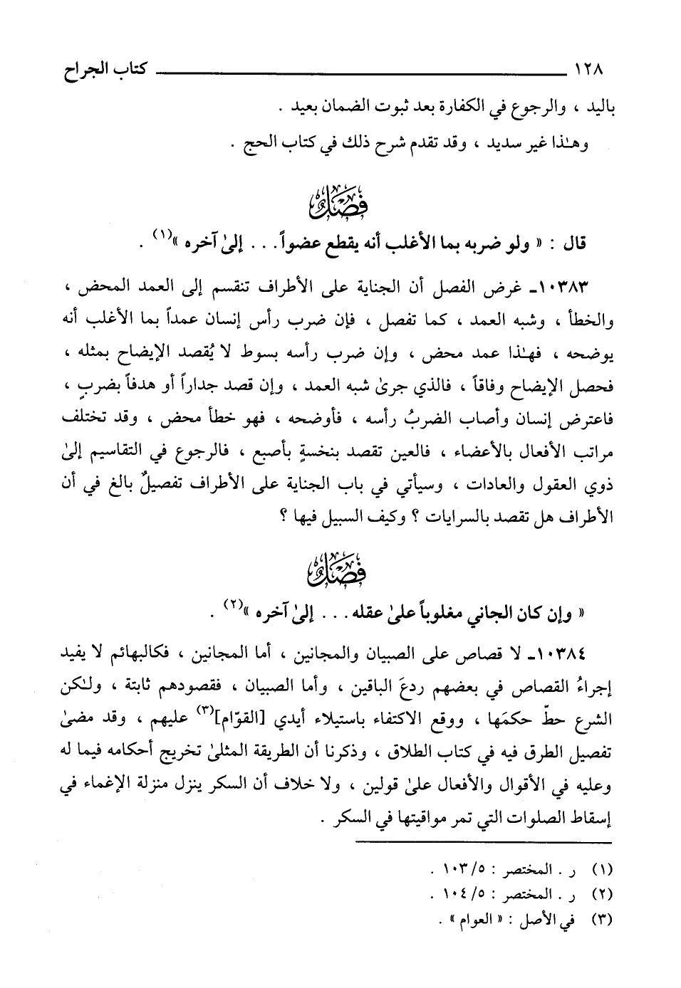 10383 - غرض الفصل أن الجناية على الأطراف تنقسم إلى العمد المحض، والخطأ، وشبه العمد، كما تفصل، فإن ضرب رأس إنسان عمداً بما الأغلب أنه يوضحه، فهذا عمد محض، وإن ضرب رأسه بسوط لا يُقصد الإيضاح بمثله، فحصل الإيضاح وفاقاً، فالذي جرى شبه العمد، وإن قصد جداراً أو هدفاً بضربٍ، فاعترض إنسان وأصاب الضربُ رأسه، فأوضحه، فهو خطأ محض، وقد تختلف مراتب الأفعال بالأعضاء، فالعين تقصد بنخسةٍ بأصبع، فالرجوع في التقاسيم إلى ذوي العقول والعادات، وسيأتي في باب الجناية على الأطراف تفصيلٌ بالغ في أن الأطراف هل تقصد بالسرايات؟ وكيف السبيل فيها؟